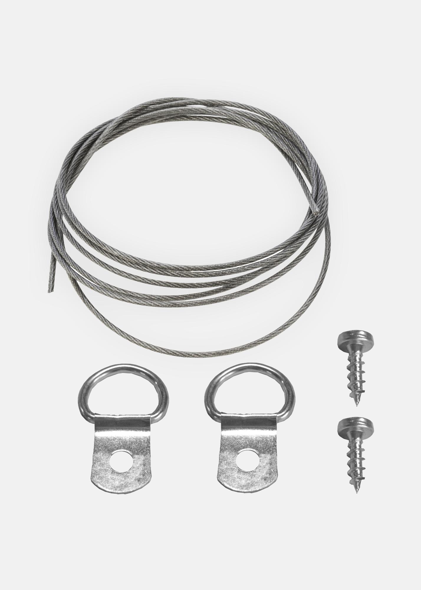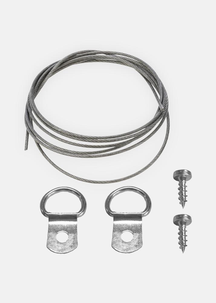 Tähän pakettiin kuuluu kaikki tarvittava teräsvaijerin kiinnittämiseen tauluusi: metrin pituinen teräsvaijeri, 2 ruuvia ja kaksi koukkua/ripustuslenkkiä. Vaijeri on galvanoitu ja kestävä. Se on ainoastaan 0,7 mm paksu ja siksi taipuisa ja helppokäyttöinen.