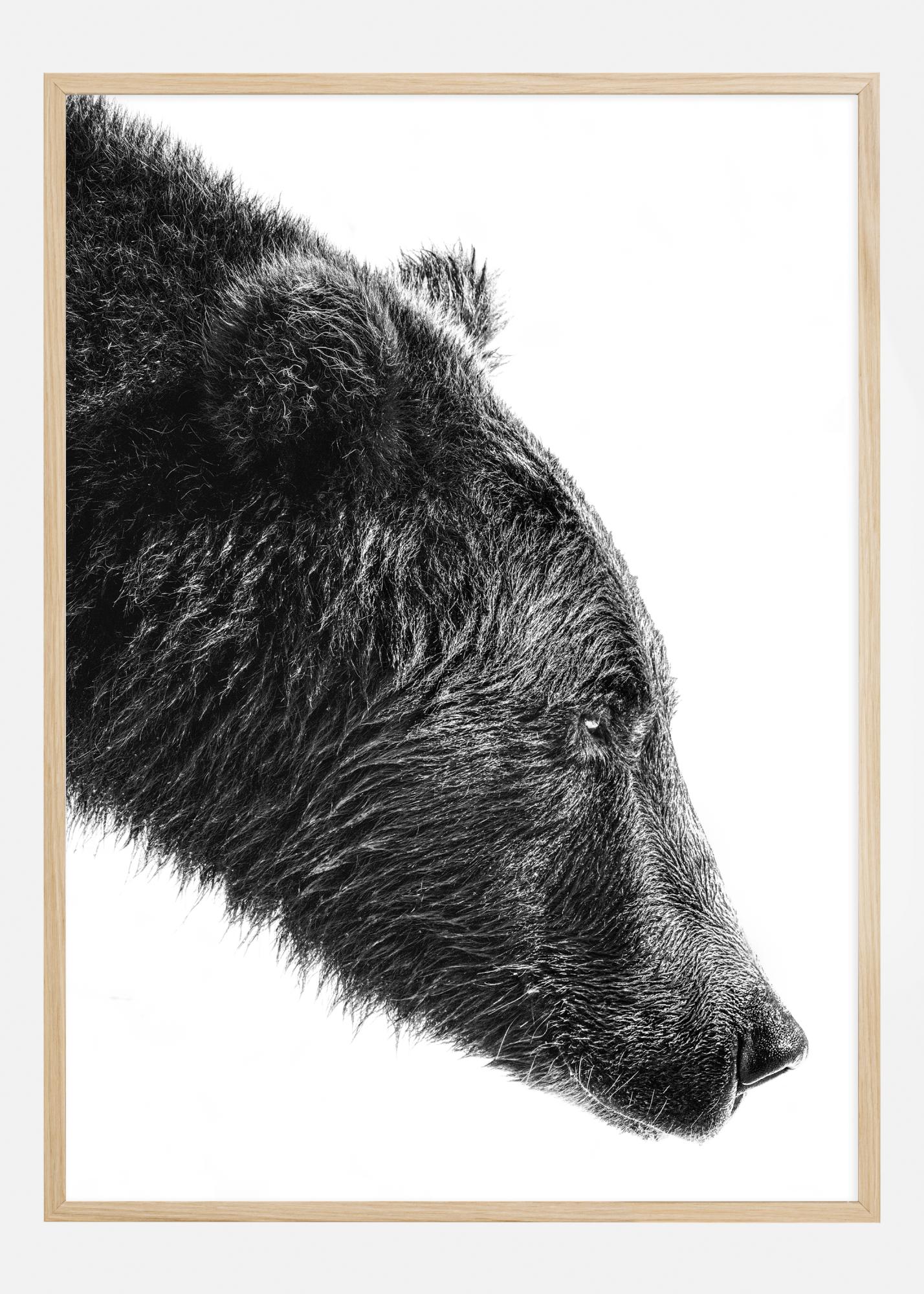 Tämä tyylikäs ja voimakas tuloste esittelee lähikuvan karhusta mustavalkoisena, aiheen, joka antaa luonnon kesyttämättömästä hengestä raapan ja rehellisen tunteen. Kuva keskittyy karhun profiiliin, jossa jokainen turkin yksityiskohta ja tyynet silmät korostuvat tummien ja vaaleiden sävyjen kontrastin ansiosta.