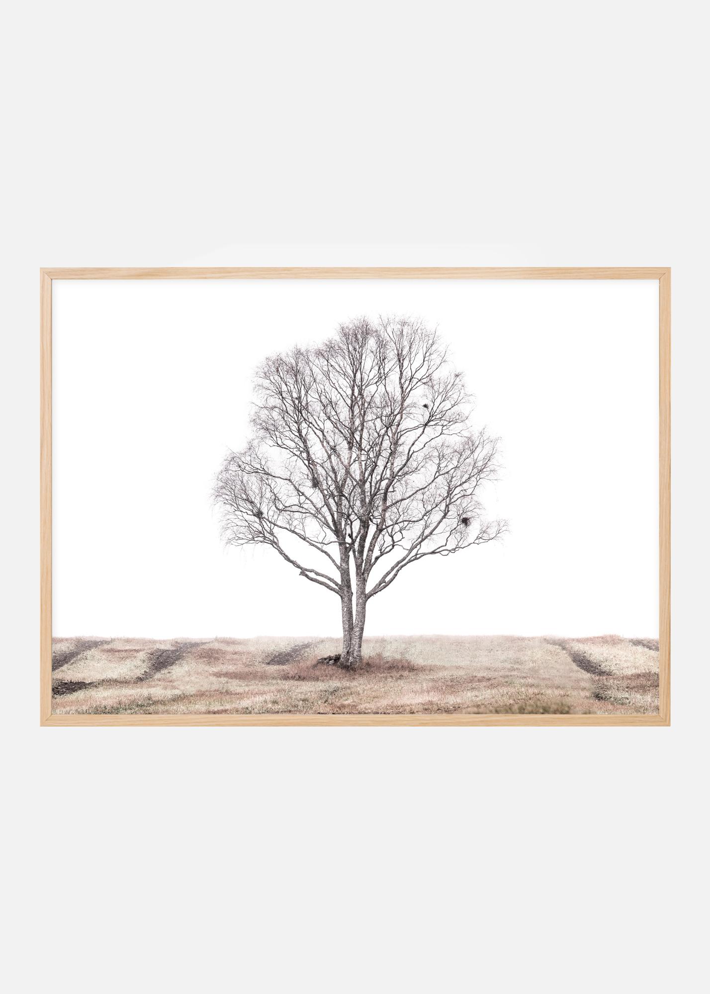 Karu juliste yhdestä yksinäisestä puusta talvella. Paljas puu on keskellä lumipölyistä peltoa, jonka takana on kirkkaan valkoinen tausta. Se on majesteettinen, mutta antaa myös kylmän sään tunnelman. Tuo pala talvea kotiisi tällä kiehtovalla kuvalla ja piristä tummaa seinää.
