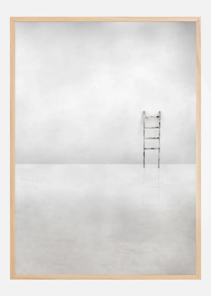 Minimalistinen juliste, jossa tikkaat nojaavat valkoista taustaa vasten. Sosiaalisiksi tikkaiksi kutsuttu yksinäinen askelmajoukko on myös asetettu valkoista lattiaa vasten. Sekä seinä että lattia ovat samoja valkoisen ja harmaan sävyjä, jolloin tikkaat rajautuvat terävästi tummemmilla sävyillä. Pidä hauskaa tämän kuvan merkityksen tulkinnassa.