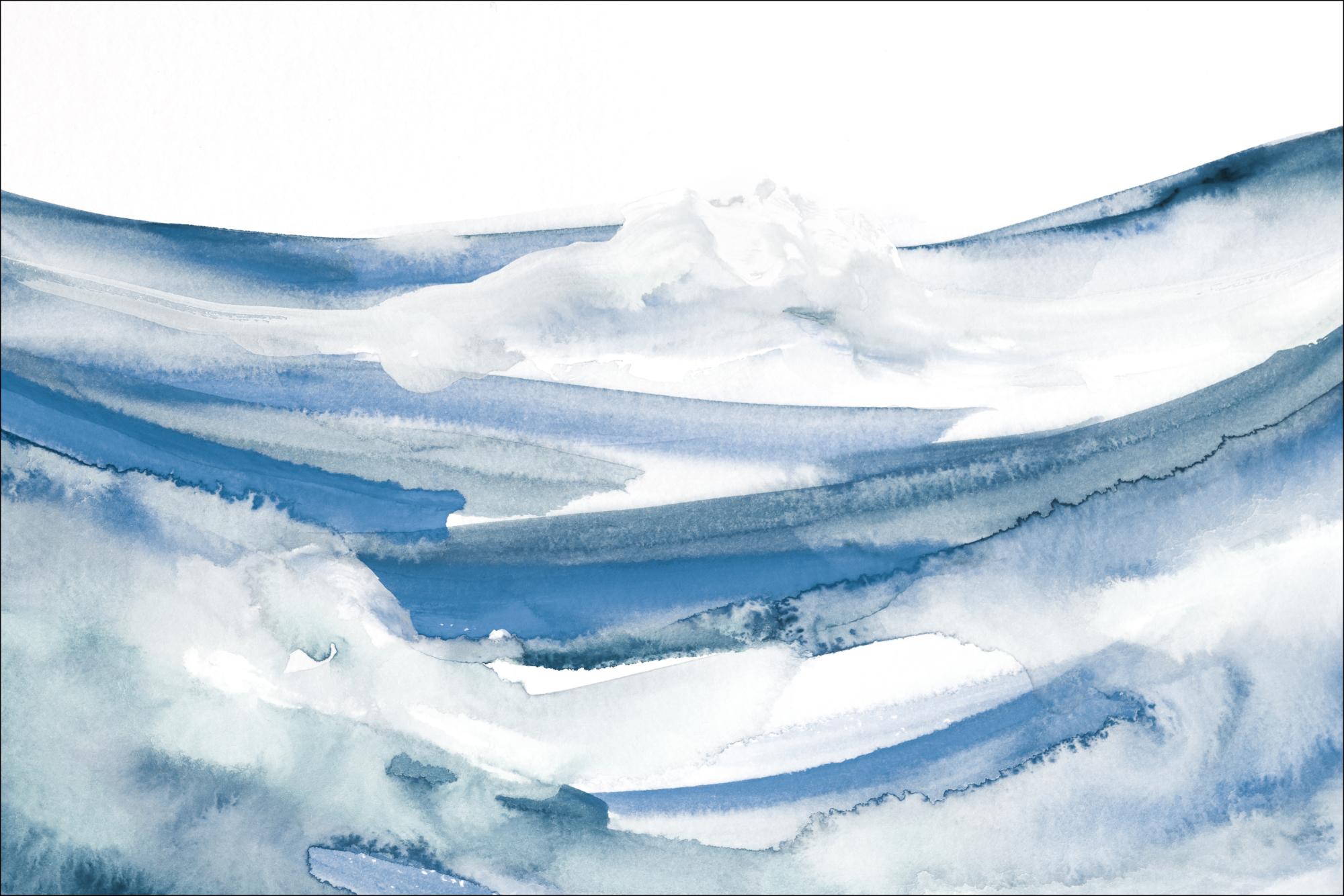 Upea kirkas juliste, jossa on suuria sinisen ja valkoisen sävyisiä siveltimen vetoja. Nämä dramaattiset värivirtaukset luovat illuusion meren aalloista. Pehmeät akvarellireunat luovat vaahtoa ja lisäävät teokseen voimakkaan toiminnan tunteen, kun maali pyörii. Tuo liikkeen tuntua seinillesi tämän nestemäisen teoksen avulla.