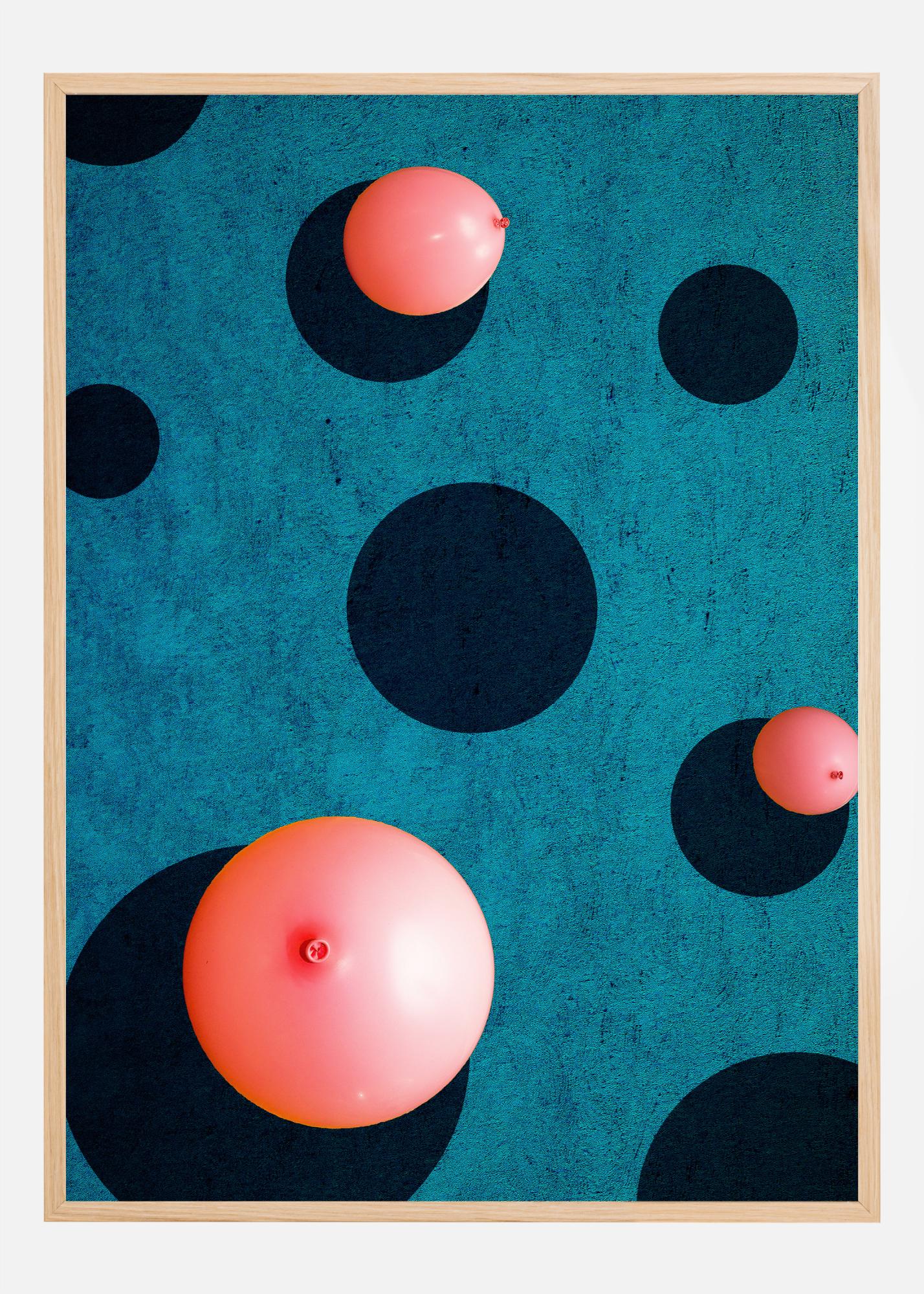 Eloisa juliste kolmesta oranssista ilmapallosta sinistä taustaa vasten. Jokainen ilmapallo heittää tumman varjon taustalle. Mutta myös tummansinisiä varjoympyröitä on enemmän. Muiden ilmapallojen täytyy leijua jossakin korkeammalla tässä oudossa, mutta lumoavassa pisteiden täyttämässä julisteessa.