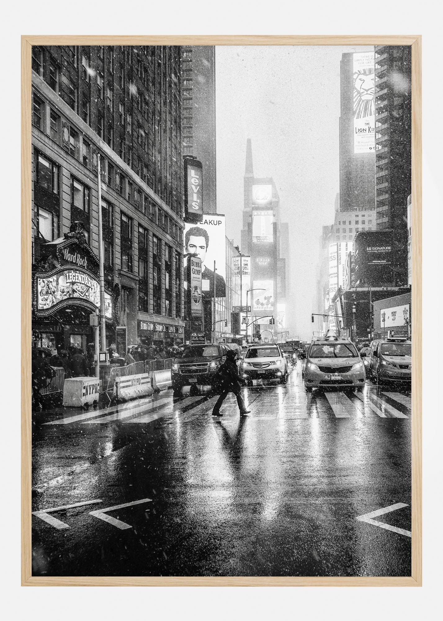 Urbaani juliste New Yorkin Times Squarelta. Tässä mustavalkoisessa kuvassa yksi henkilö ylittää kadun yöllä sateessa. Autot odottavat kaikki, että pääsevät jatkamaan matkaa. Kirkkaat mainostaulut ja pilvenpiirtäjät näkyvät kaukaisuudessa, kun tuijotat kadulle. Tunnelma on käsin kosketeltavissa, voisit melkein olla itse paikalla.