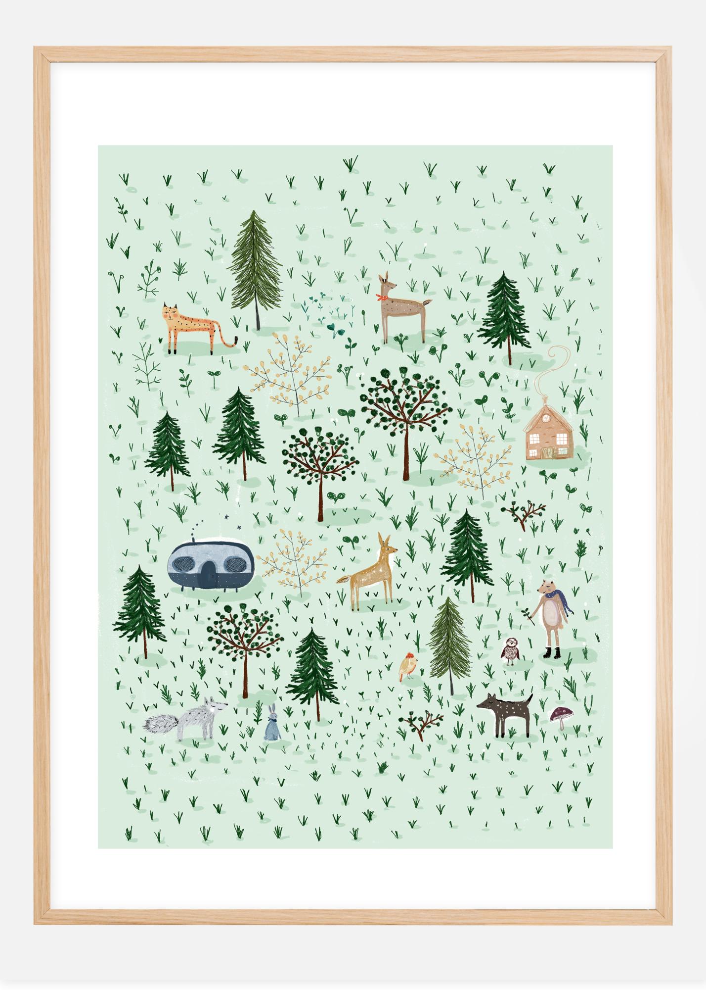 Hauska juliste pienestä metsästä, joka on pääasiassa täynnä erilaisia eläimiä. Tämä on graafinen piirros, jossa on yksinkertaistettuja puita, eläimiä ja taloja pilkottuna. Mikään ei ole mittakaavassa. Kuvassa on suuri pystyyn nouseva kettu huivissa ja saappaissa, pieni talo ja massiivinen asuntovaunu. Se on hieman kruusattua, söpöä ja muistuttaa joulukorttia. Loistava lisä mihin tahansa asuintilaan.