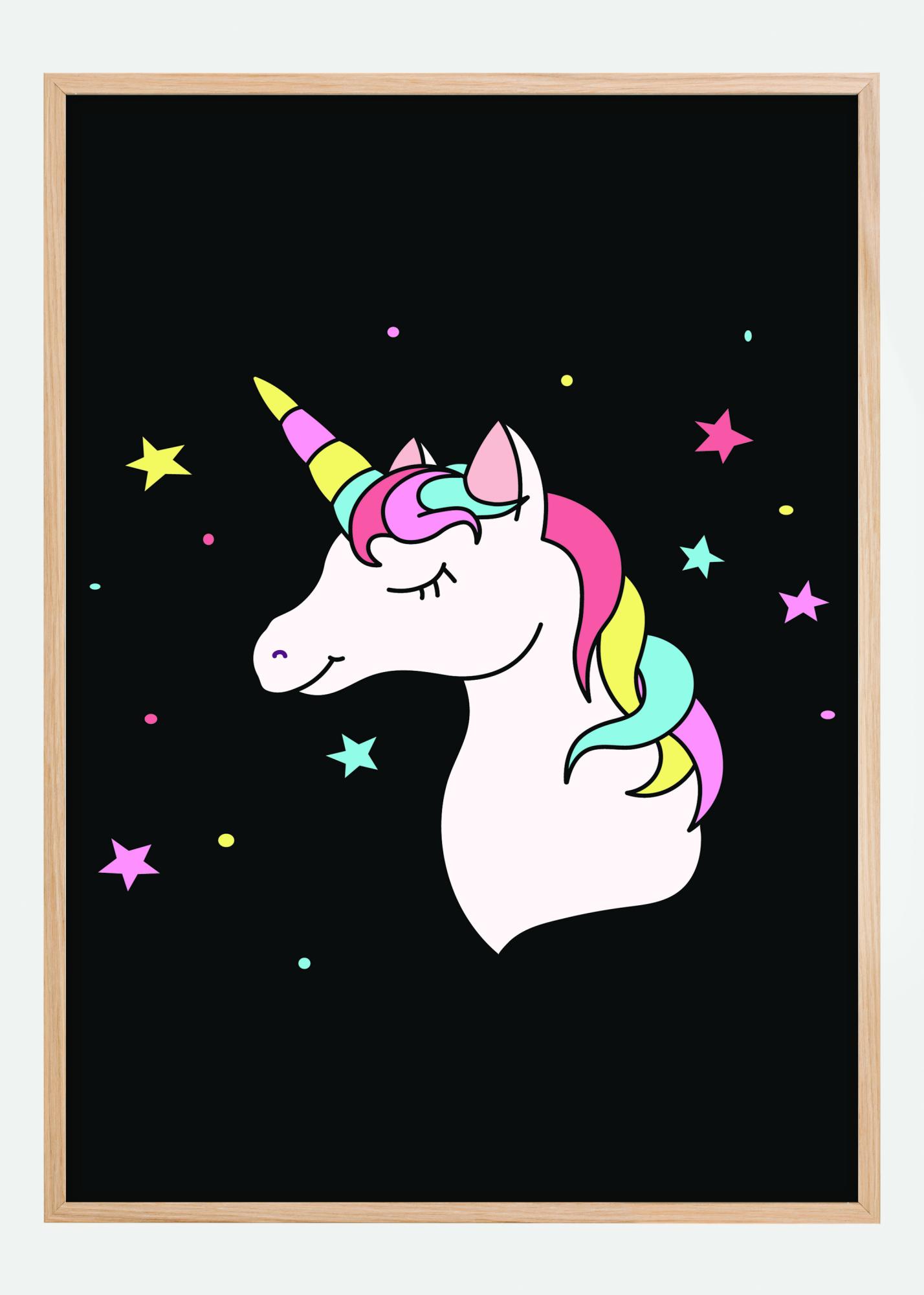 Söpö juliste lapsenomaisesta valkoisesta yksisarvisesta mustalla taustalla. Yksisarvisella on vaaleanpunainen, keltainen ja turkoosi harja ja sarvi. Samanväriset tähdet täyttävät mustan taustan takana ja luovat hauskan prinsessatunnelman. Lisää tämä lapsesi makuuhuoneeseen, jotta saat hauskan ja omituisen kuvan, joka vetoaa hänen fantasiaansa.