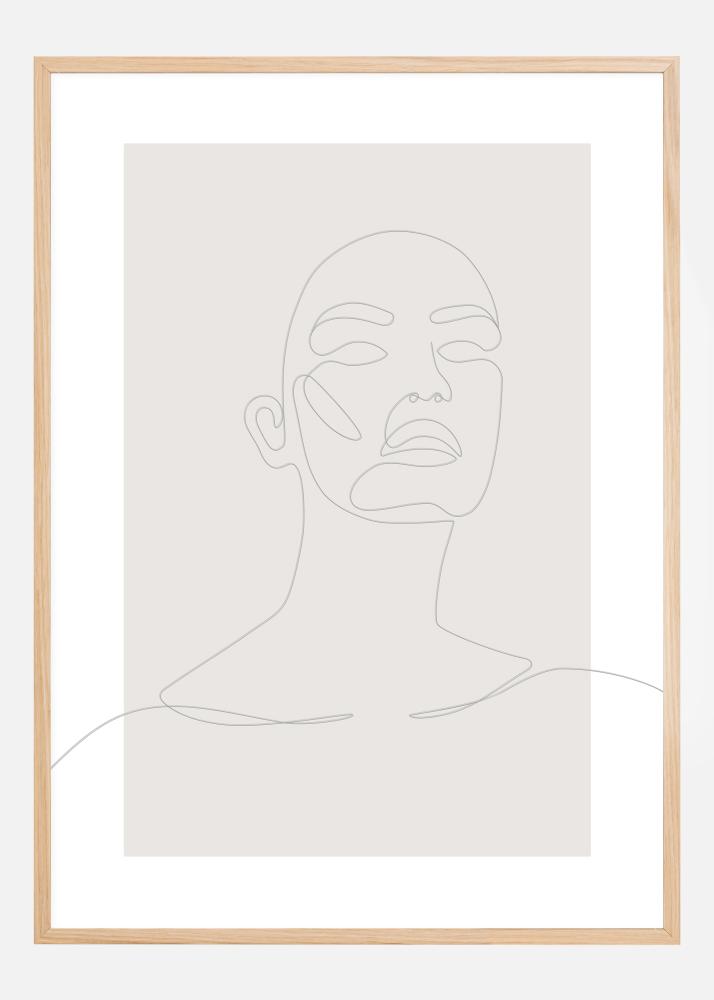 Ainutlaatuinen abstrakti muotokuvajuliste, jossa kasvot koostuvat yhdestä viivasta. Ohuella mustalla viivalla on piirretty kokonaiset kasvot vaivattomasti yhdellä viivalla koko paperia hyödyntäen. Tausta on pehmeän harmaa, ja katsoessasi kuvaa tarkasti voit arvostaa kaikkia yksityiskohtia.
