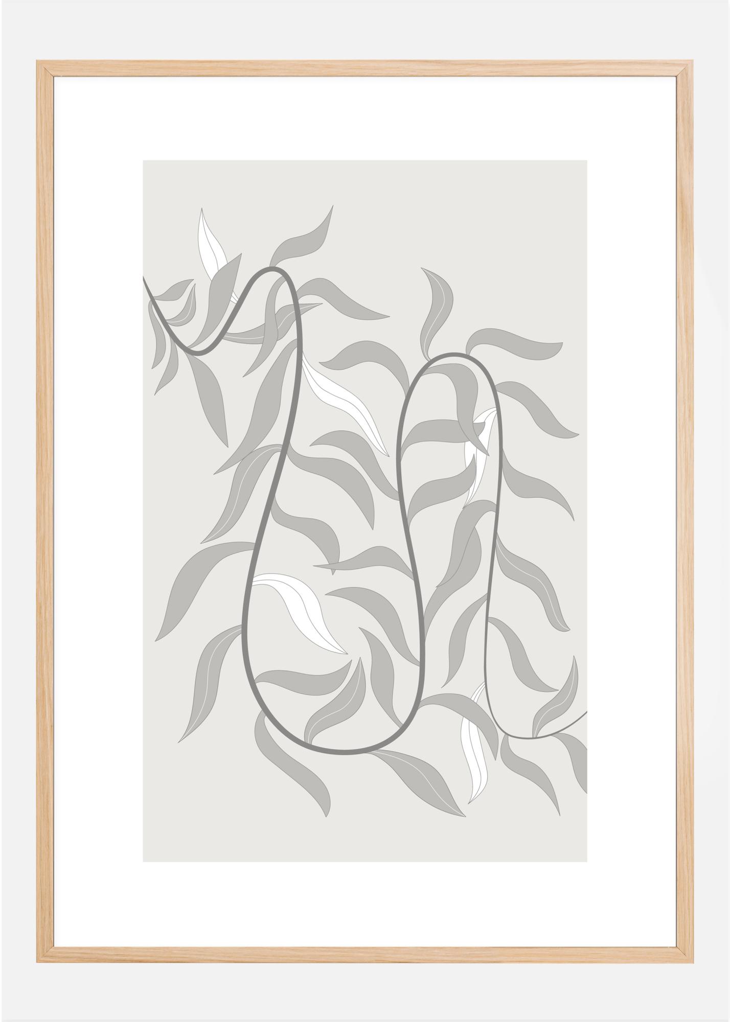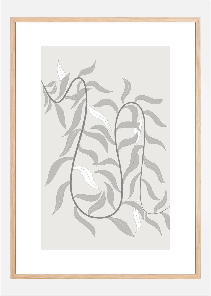 Abstrakti kasvitieteellinen juliste, jossa köynnös kiemurtelee julisteen poikki. Suunnittelu on yksinkertaista painotyyliä, jossa lehdet ovat vaaleanharmaita ja valkoisia. Tummanharmaa köynnös kiemurtelee lehtien välissä ja yhdistää ne yhdeksi kiemurtelevaksi muodoksi. Yhdistä pehmeän vihreän seinän kanssa saadaksesi lehtimäisen vaikutelman.