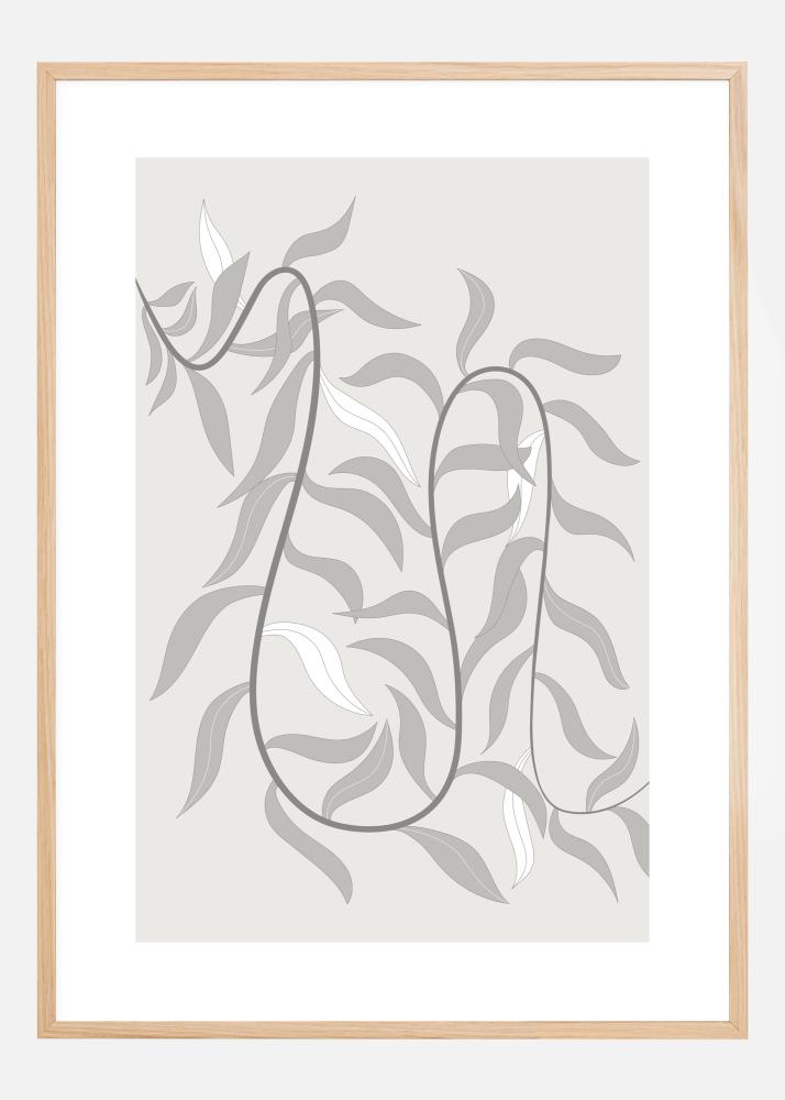 Abstrakti kasvitieteellinen juliste, jossa köynnös kiemurtelee julisteen poikki. Suunnittelu on yksinkertaista painotyyliä, jossa lehdet ovat vaaleanharmaita ja valkoisia. Tummanharmaa köynnös kiemurtelee lehtien välissä ja yhdistää ne yhdeksi kiemurtelevaksi muodoksi. Yhdistä pehmeän vihreän seinän kanssa saadaksesi lehtimäisen vaikutelman.