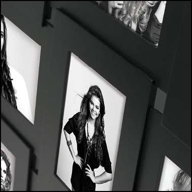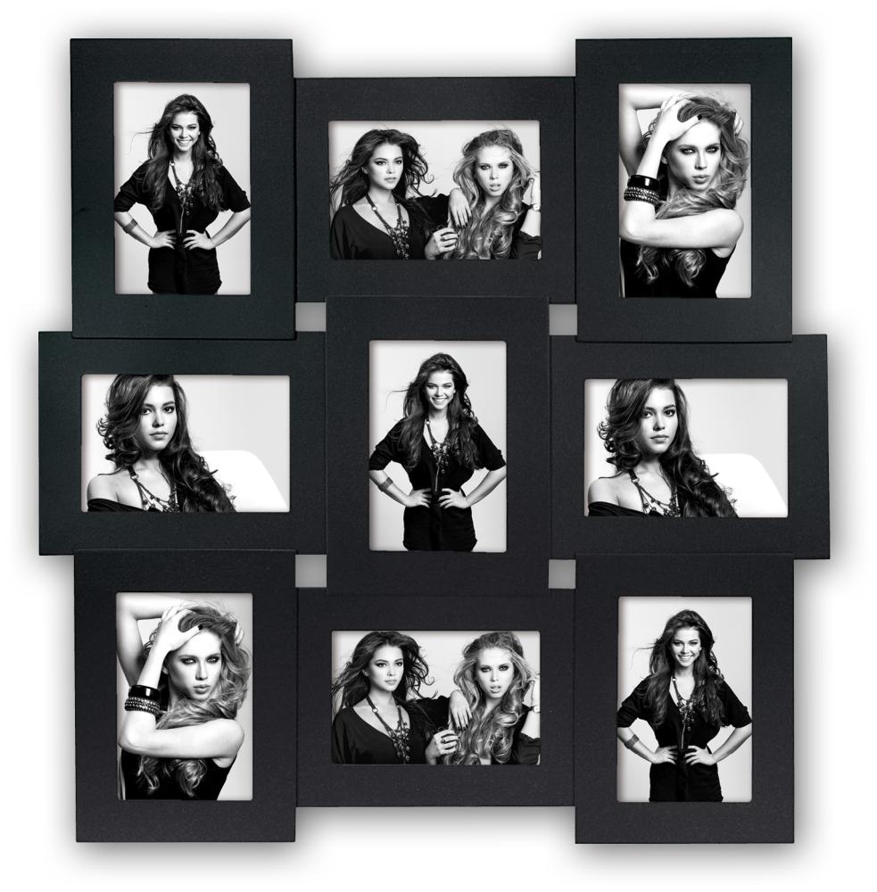 Moderni, musta kollaasikehys, jossa paikka yhdeksälle kuvalle maisema- ja muotokuvaformaateissa. Tilaa tänään ja saa persoonallinen valokuvakollaasisi paikalleen jo viikonlopuksi!