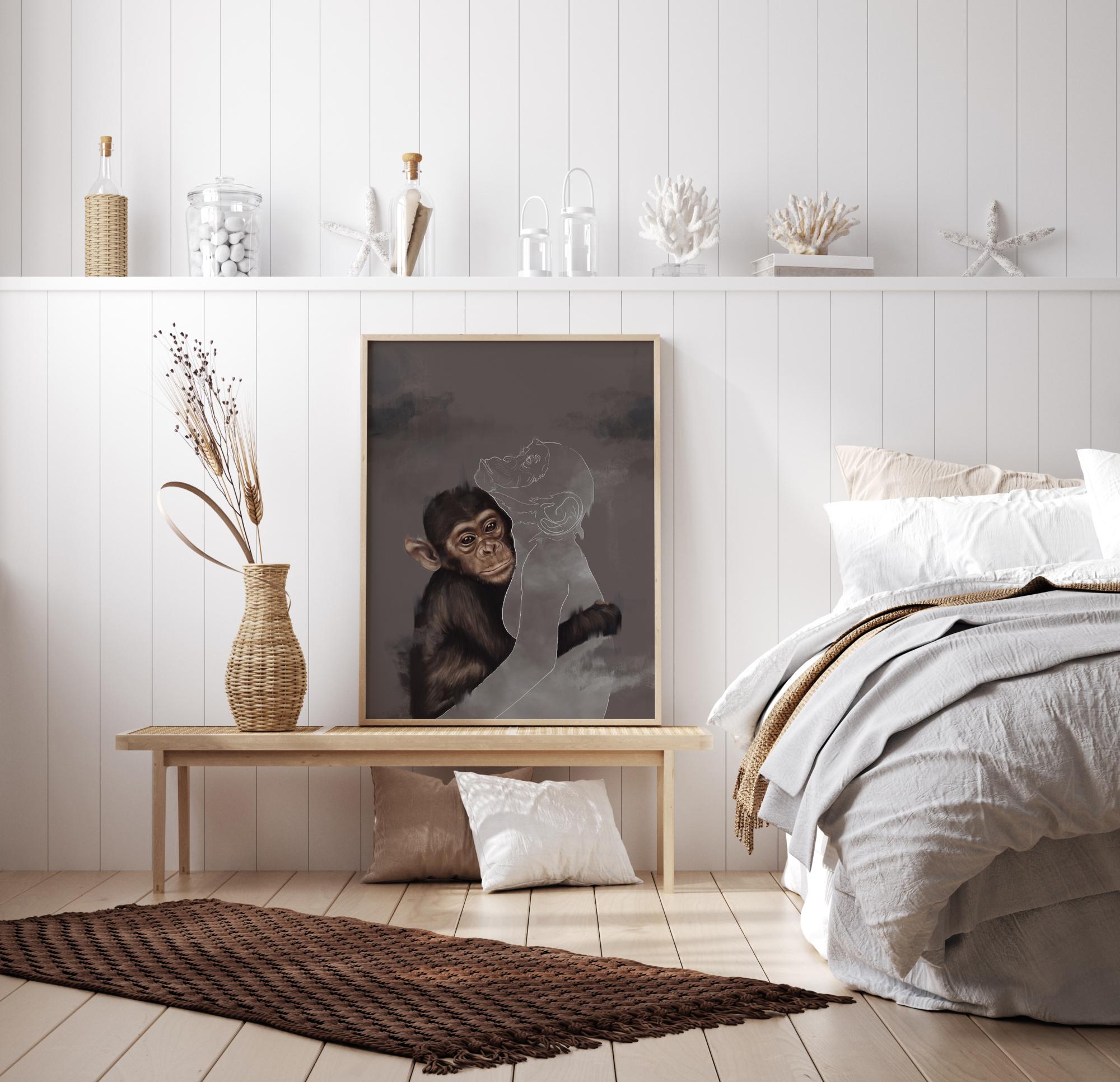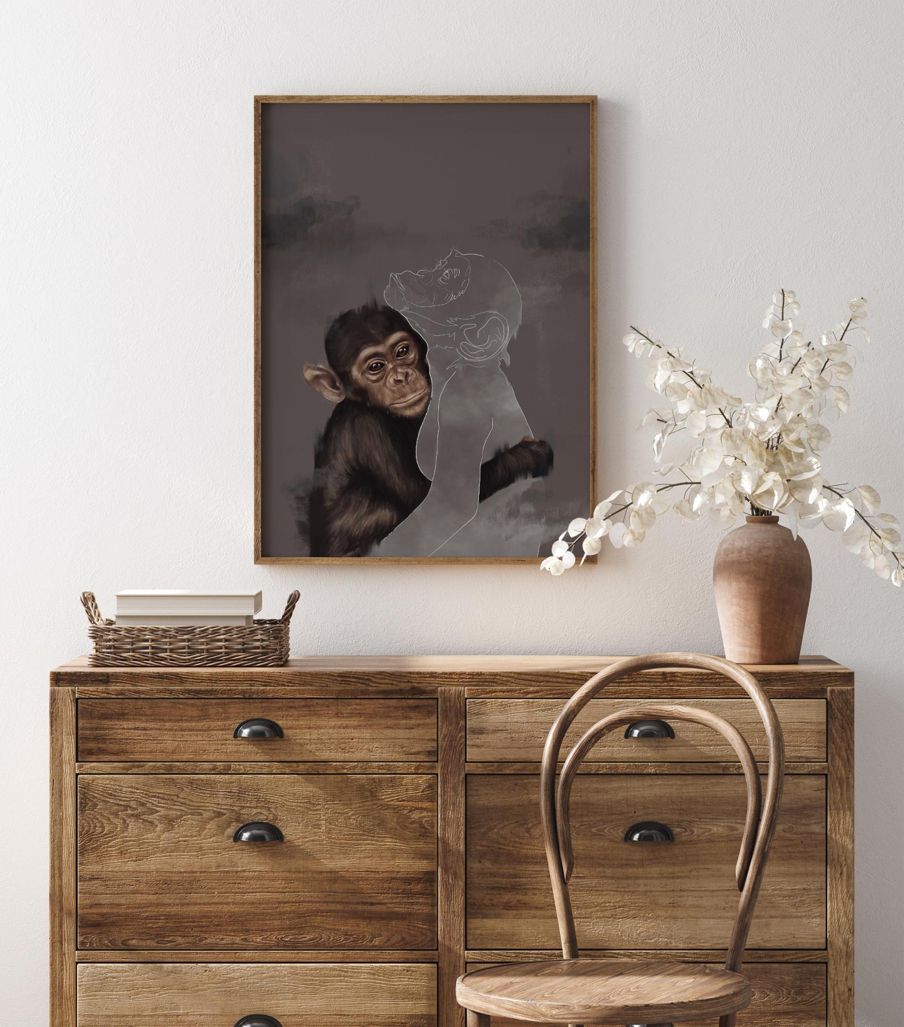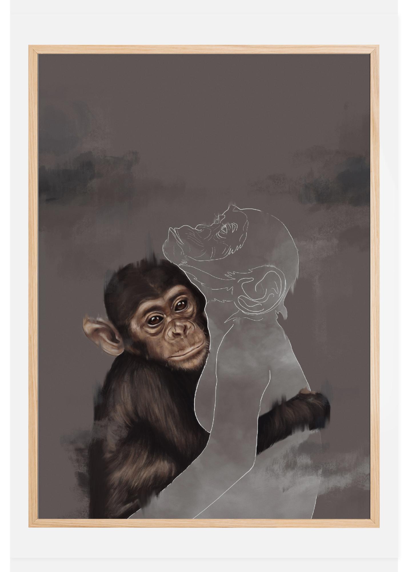 Upea juliste, jossa nuori simpanssi halaa toista simpanssia, jolla on vain ääriviivat. Tässä tunteikkaassa julisteessa on yksityiskohtainen maalaus simpanssista, joka kietoo kätensä toisen simpanssin valkoisen ääriviivan ympärille. Toinen puuttuu, joten missä tämä toinen apina on ja miksi sitä ei enää ole?