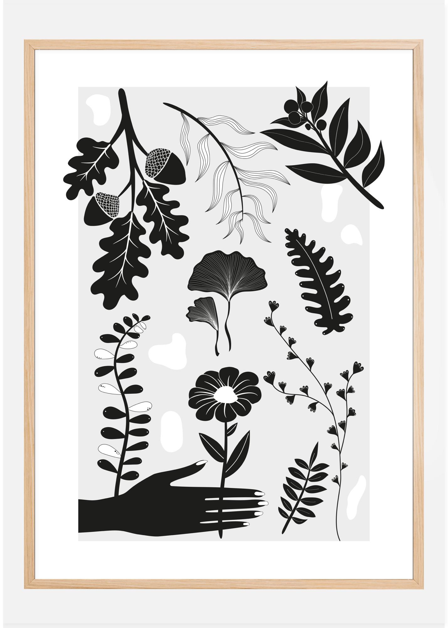 Rohkea juliste, jossa on mustavalkoisia painokuvioita erilaisista lehdistä, kasveista ja kukista. Musta käsi kurottautuu tarttumaan yhteen tyylitellyistä kukista. Tammenterhot, kukat, saniaiset ja muut täyttävät tämän yksinkertaisen mutta mielenkiintoisen painatuksen. Pääset kasvitieteen tunnelmaan, kun lisäät tämän kasvijulisteen kotiisi.