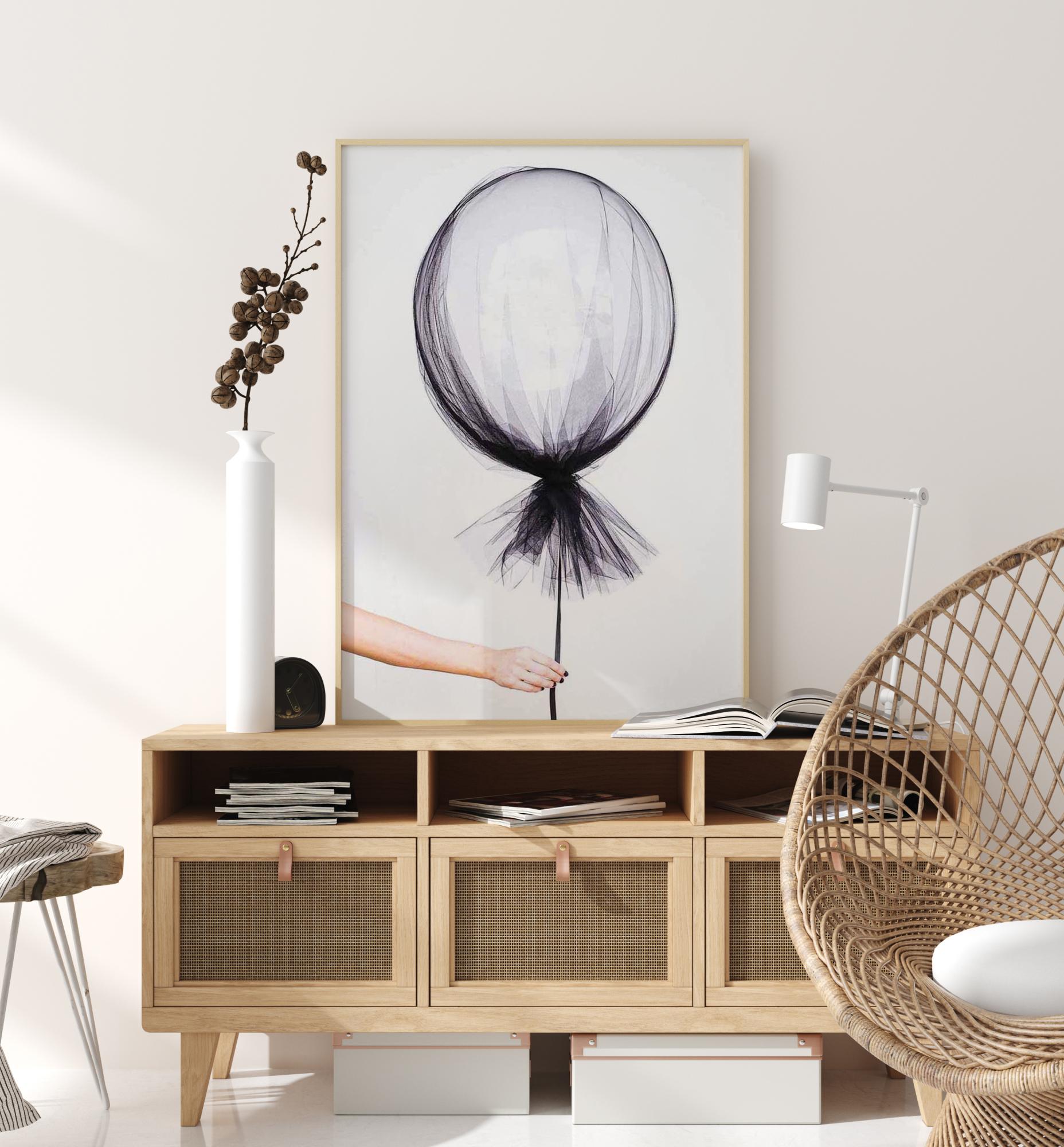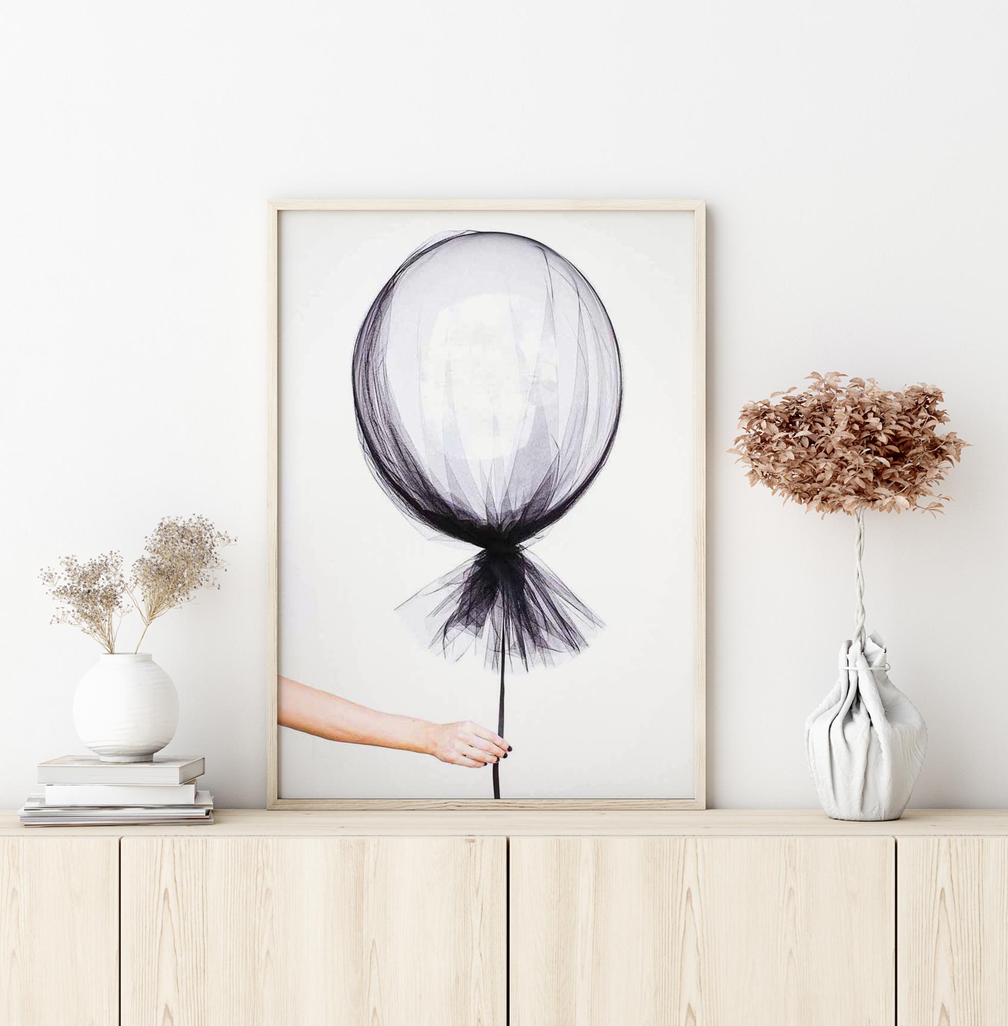 Tyylikäs valokuvataide kuvasta, jossa käsi pitää leijuvaa palloa ohuen läpinäkyvän kankaan ympäröimänä. Viehättävä juliste, joka huokuu ihastuttavaa sekoitusta kepeän leikkisyyden ja haurauden tunteita. Sopii yhtä hyvin lastenhuoneeseen kuin moderniin kotiin.