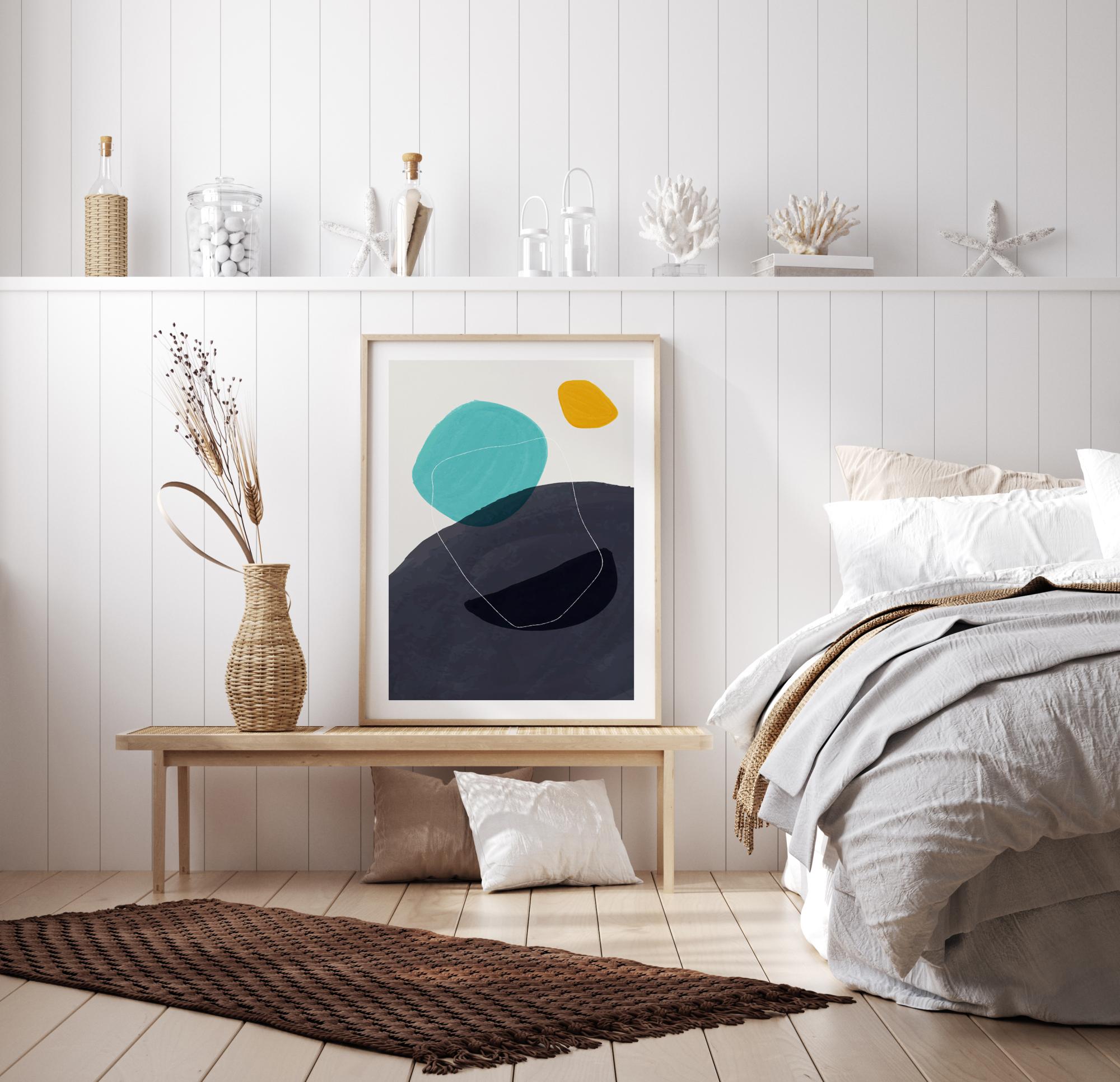 Värikäs abstrakti juliste, jossa on outoja, erivärisiä muotoja. Suurimman osan kuvasta täyttää kaareva harmaa muoto. Päällimmäisenä on vauvamaisen sinisen värinen ympyrä, jossa on pieni pyöreä oranssi muoto. Valkoiset viivat ja musta puoliympyrän muoto peittävät suuren harmaan muodon. Löydä sisäinen taidekriitikkosi tämän ainutlaatuisen julisteen avulla.