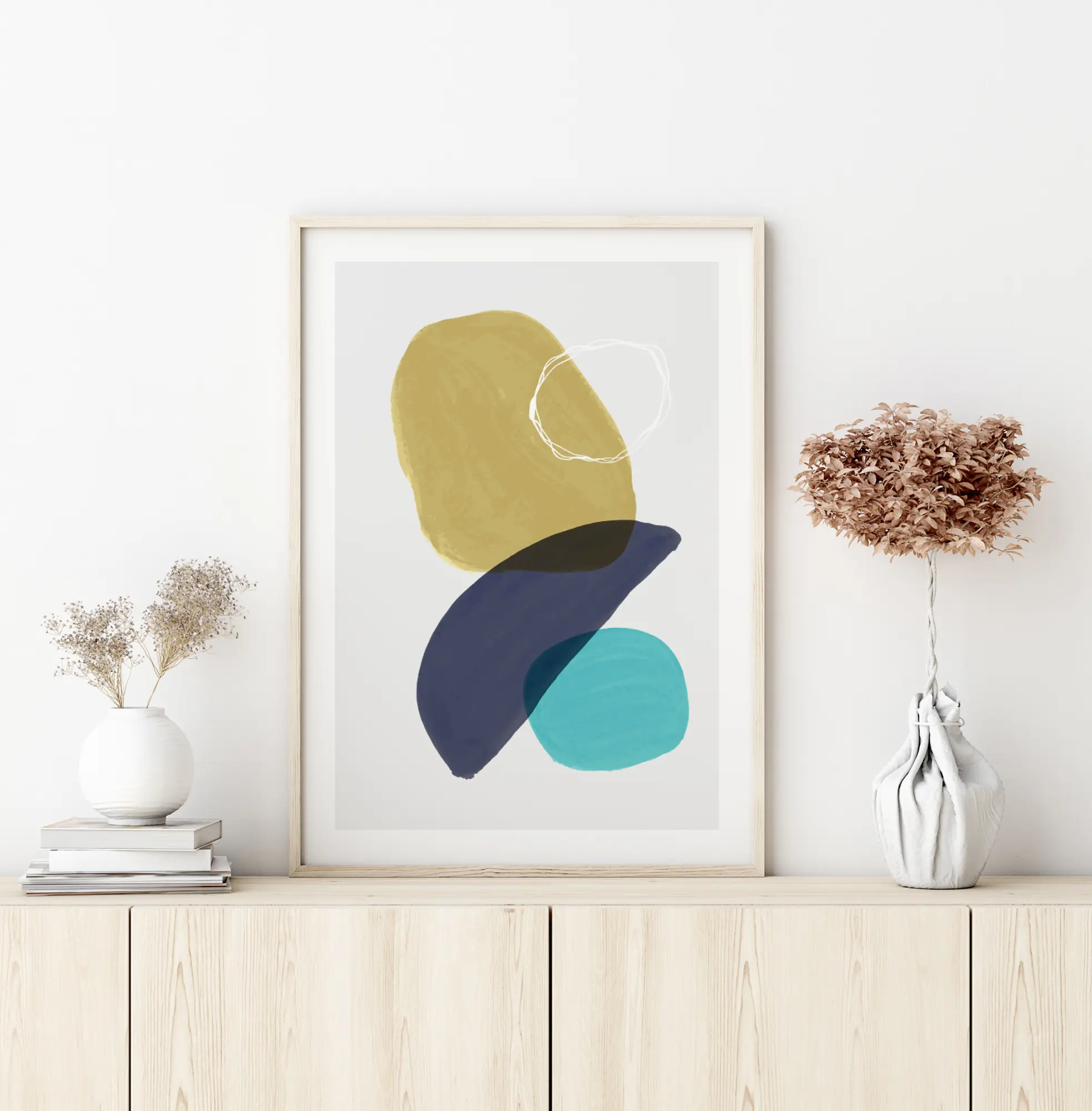 Abstrakti juliste, jossa on erilaisia muotoja eri väreissä. Alareunassa on kirkkaan sininen ympyrä. Sen päällä on sininen puoliympyrä ja sen yläpuolella beige ympyränmuoto. Kaikki ovat harmaalla pohjalla. Hauskat eloisat muodot luovat tämän kiehtovan kuvan, joka piristää mitä tahansa huonetta kodissasi.