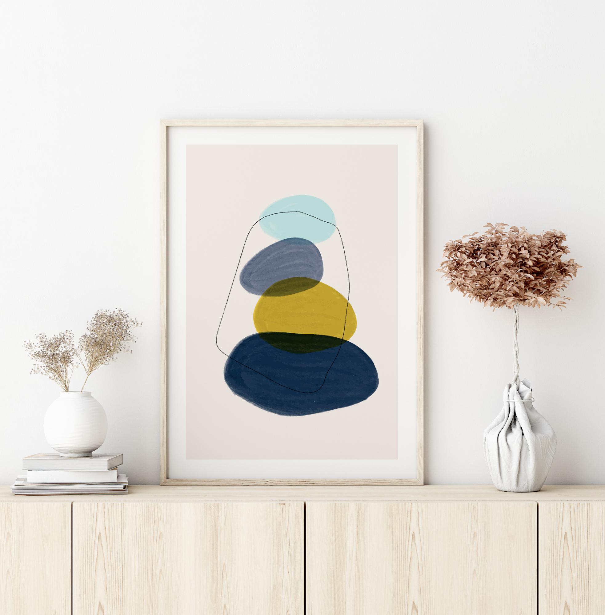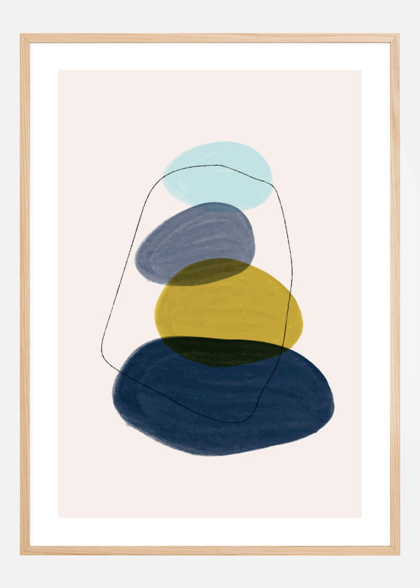 Hauska abstrakti juliste erilaisista pyöreistä muodoista, jotka näyttävät kiviltä. Muodot alkavat suurina ja pienenevät vähitellen, kun ne kasaantuvat toistensa päälle tässä hauskassa kuvassa. Kuvan tummansiniset, vaaleansiniset ja keltaiset sävyt tekevät tästä kirkkaan ja piristävän teoksen kotiisi.