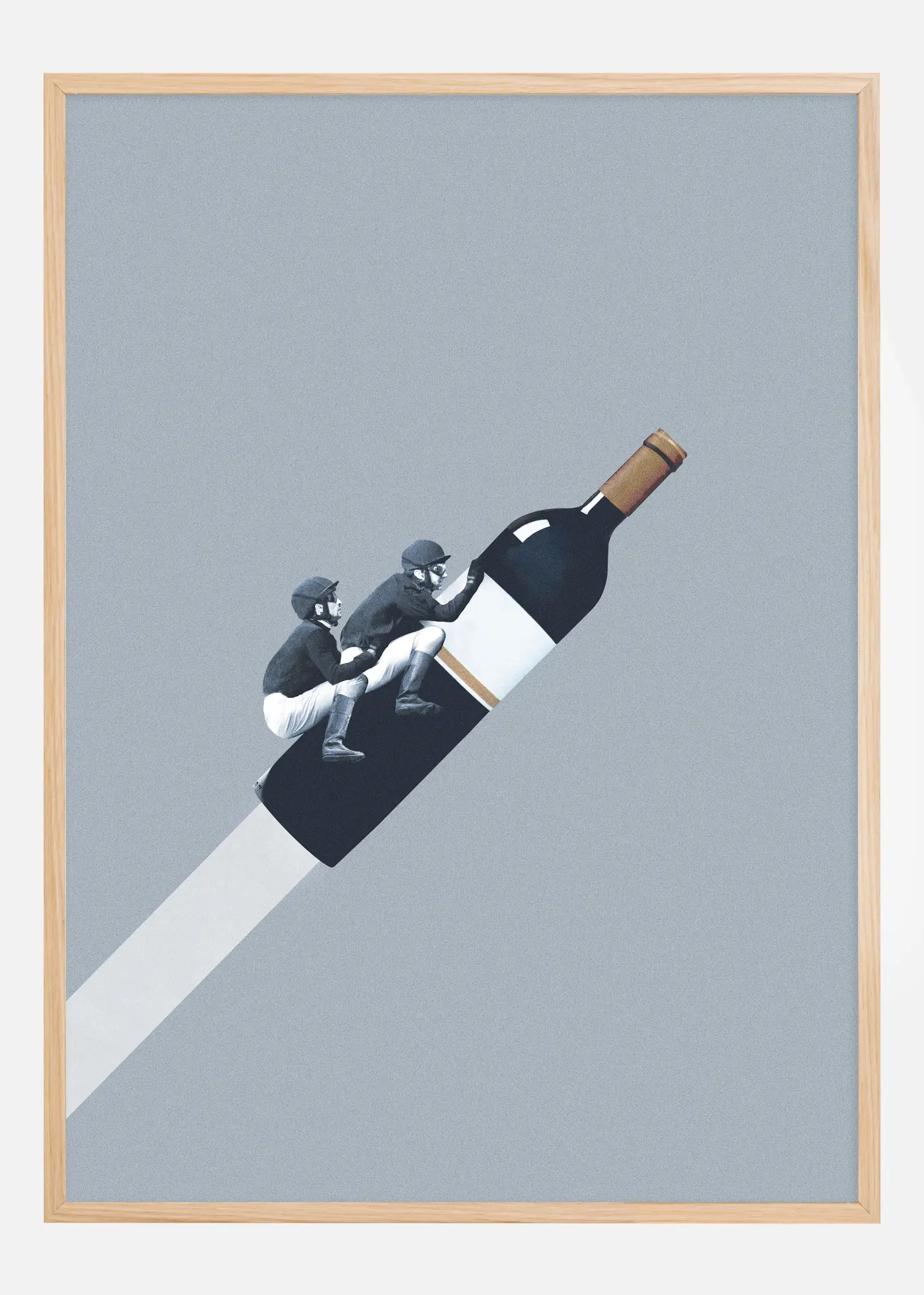 Värimaailma on hillitty mutta ilmeikäs, jossa viileät siniset sävyt taustalla täydentävät ratsastusvaatteiden tummempia sävyjä ja viinipullon syvää mustaa. Se yhdistää modernin estetiikan ja nostalgian tunteen, mikä tekee tästä julisteesta täydellisen taiteellisen kosketuksen kotiin, joka arvostaa perinteen ja huumorin yhdistelmää. Se on nykyaikainen tulkinta myrskyn ratsastamisesta, joka tuo tyylikkään ja samalla humoristisen lisän mihin tahansa huoneeseen.
