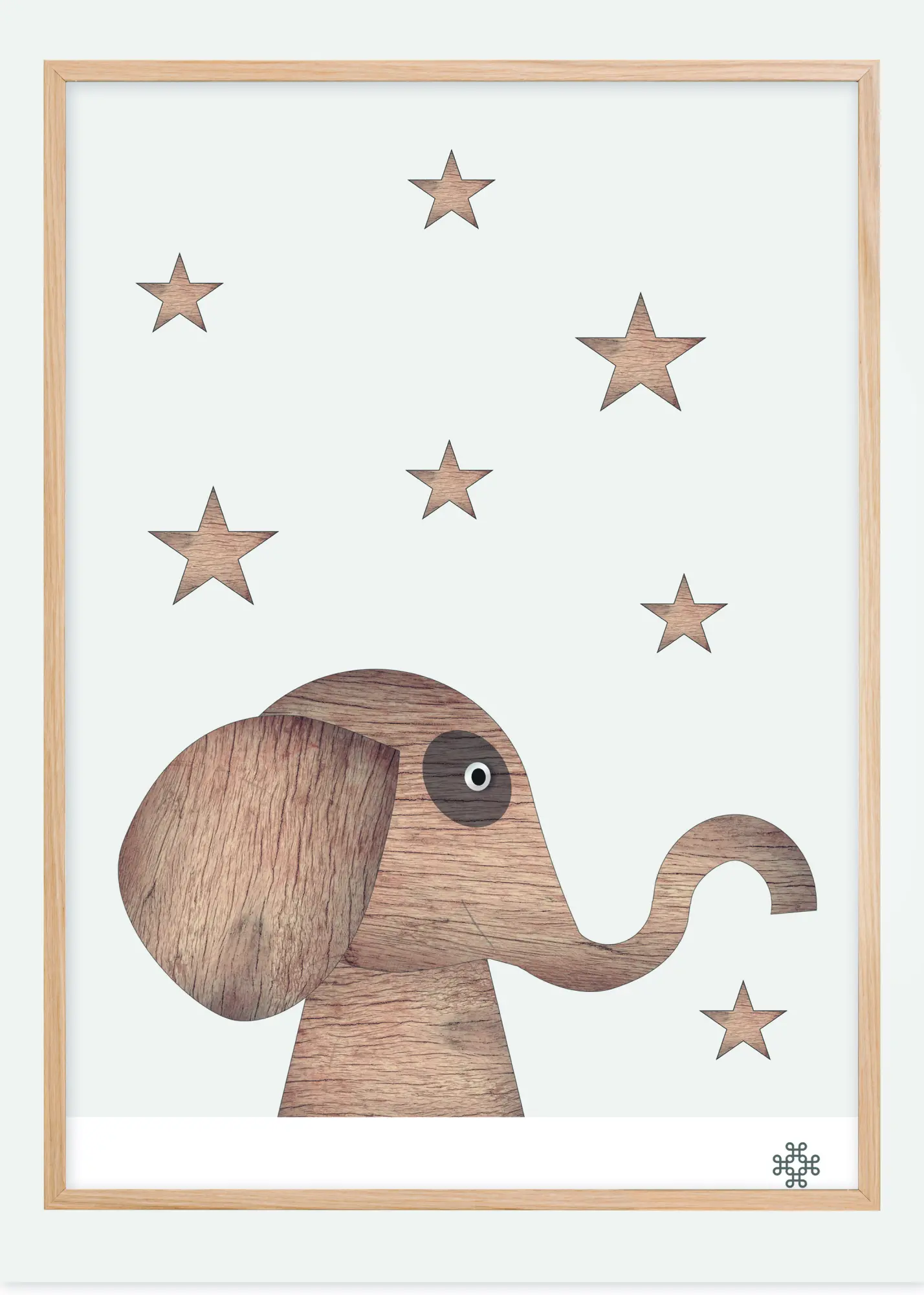 Juliste puisesta norsusta, missä tähdet ympäröivät söpöä norsua. Elefantti on tehty puisista laudoista, mikä antaa sille puisen tekstuurivaikutelman. Tähdet ovat sijoitettu ympärille luomaan tämä omituinen kuva, joka olisi positiivinen iloinen lisä mihin tahansa lastenhuoneeseen.