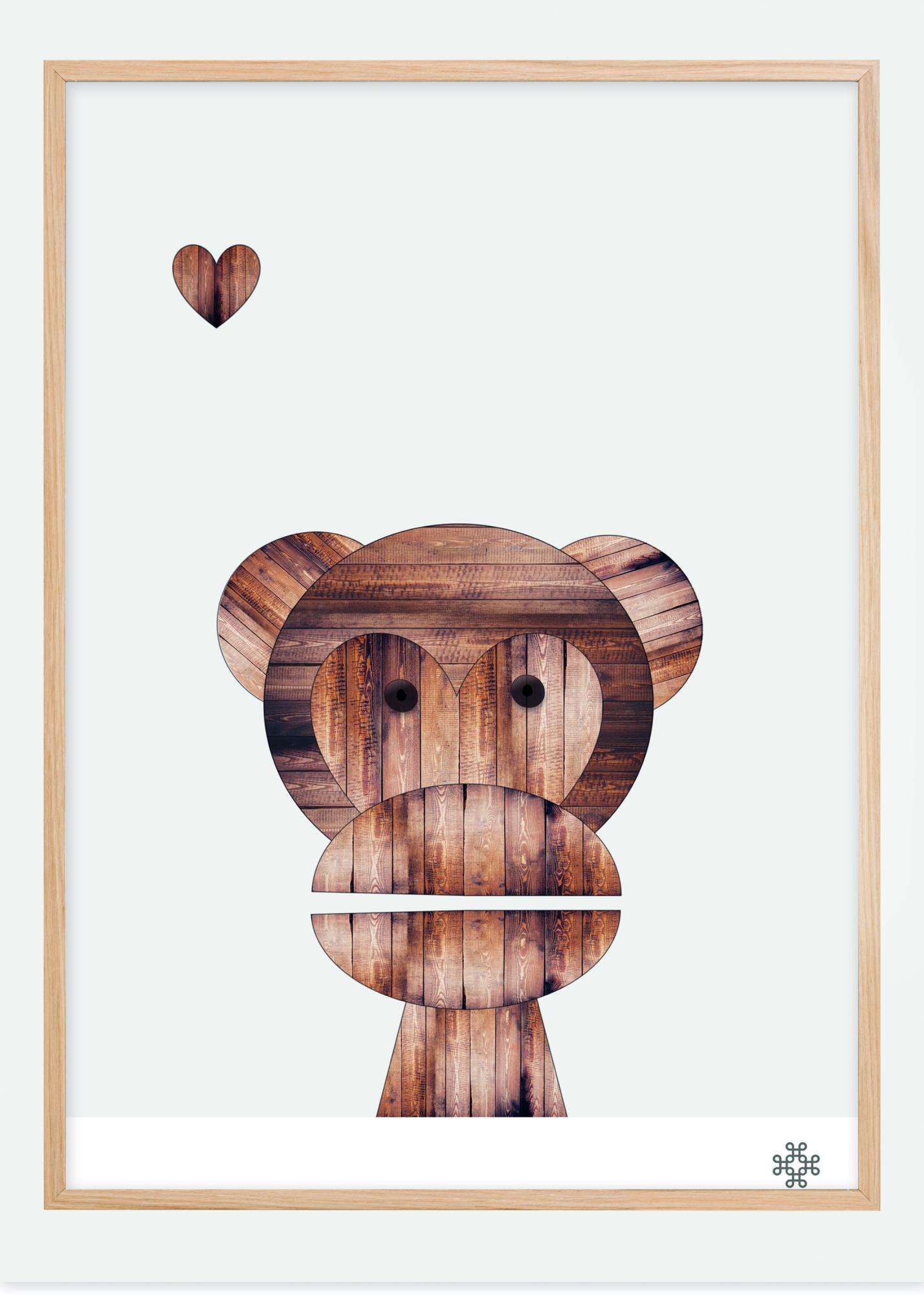 Juliste, jossa puulankuista on tehty apina. Apinan yläpuolella on pieni sydän. Apina tuijottaa sinua kuvasta antaen sinulle kaiken rakkauden. Omituinen ja outo, tämä pieni rakkausapina on täydellinen vaihtoehto lapsen makuuhuoneen sisustukseen.