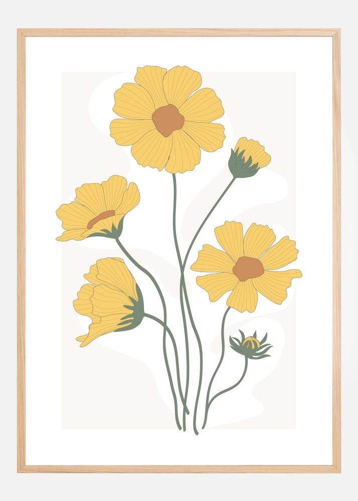Kirkas juliste keltaisista kehäkukista, jotka ovat luotu hauskalla painotyylillä. Jokainen kukka hehkuu valkoista taustaa vasten. Vaikka kyseessä on yksinkertainen tyylitelty kuvio, kukat ovat iloisia ja täydellinen tapa on herätä hymy huulilla.