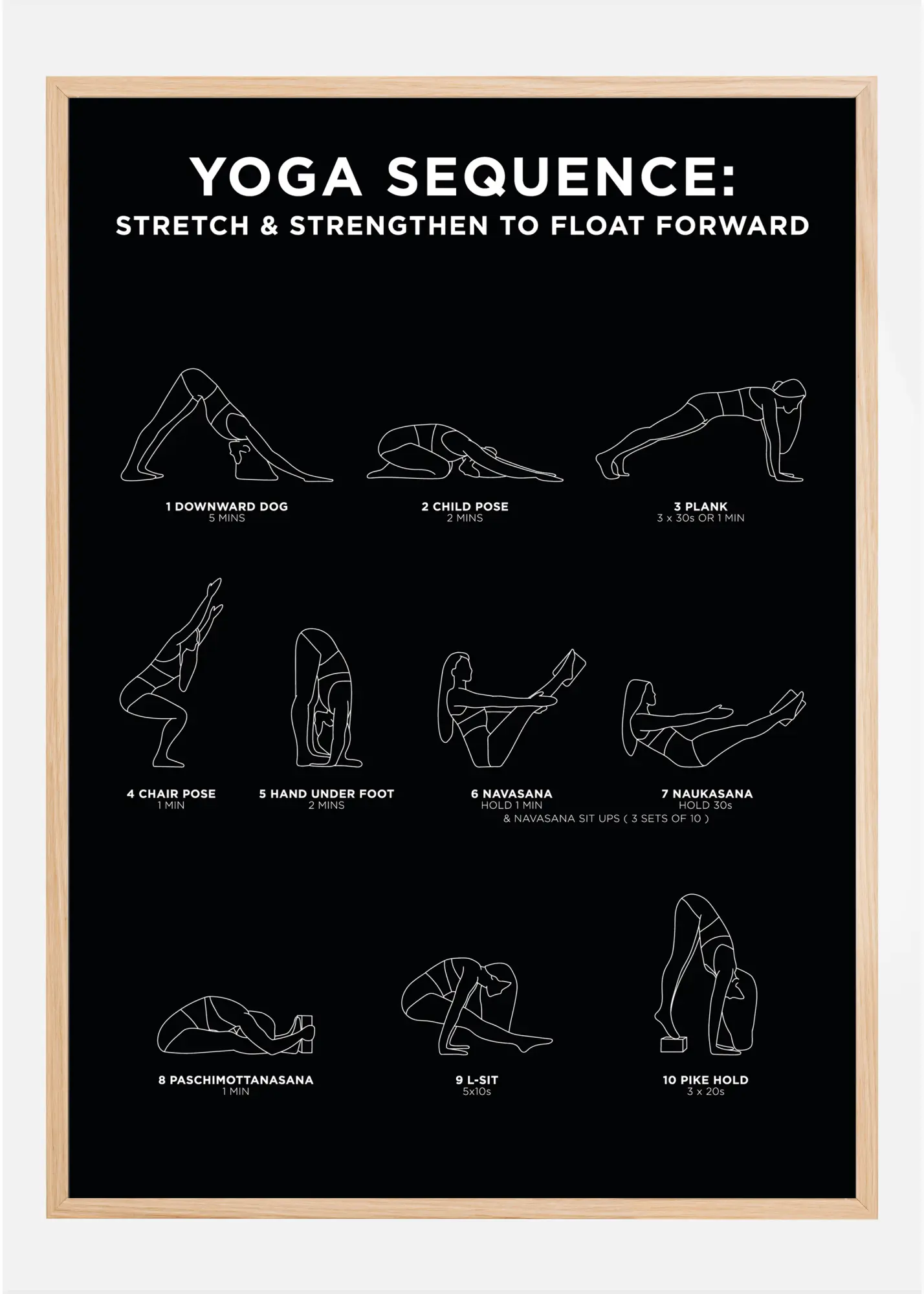 Tässä julisteessa on tyylikäs ja pelkistetty muotoilu, minkä lisäksi se on todella hyödyllinen, jos haluat oppia joogaamaan venyttelyyn ja voimaan keskittyen. Juliste nimittäin näyttää selkeästi sen, kuinka näihin joogaamisen osa-alueisiin keskittyvät joogasarjan asennot tulee suorittaa, ja kuinka kauan kussakin asennossa tulisi pysyä. Trendikkäät julisteet jotka ovat sovitettu edullisesti muihin motiiveihin tauluseinän luomiseen. Älä unohda täydentää meidän tyylikäistä kehyksien tai juliste ripustin kanssa.