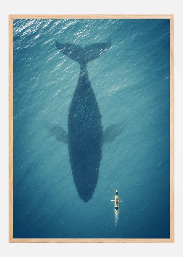 Tämä kiehtova juliste vangitsee hetken, jossa kajakkimeloja ja majesteettisen valaan siluetti näkyvät juuri kimaltavan meren pinnan alla. Kontrasti pienen aluksen ja valtavan valaan välillä luo vahvan tunteen luonnon majesteettisesta mittakaavasta, samalla kun sininen väripaletti välittää rauhan ja meren tuntemattomien syvyyksien tunteen.