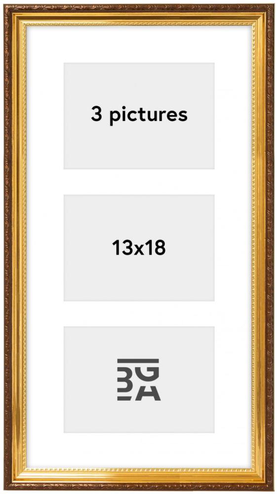 Tämän valokuvakehyksen ansiosta voit koristaa kotisi seinät perheen, ystävien ja muutenkin ihanien muistojen kuvilla. Tähän kehykseen mahtuu kolme 13x18 cm. Kullanvärisen, retrotyylisen kehyksen ulkoreunaa kiertää koristeellinen, lämpimänruskeasävyinen ulkolista. Kehys on varustettu ripustuskoukuilla.
