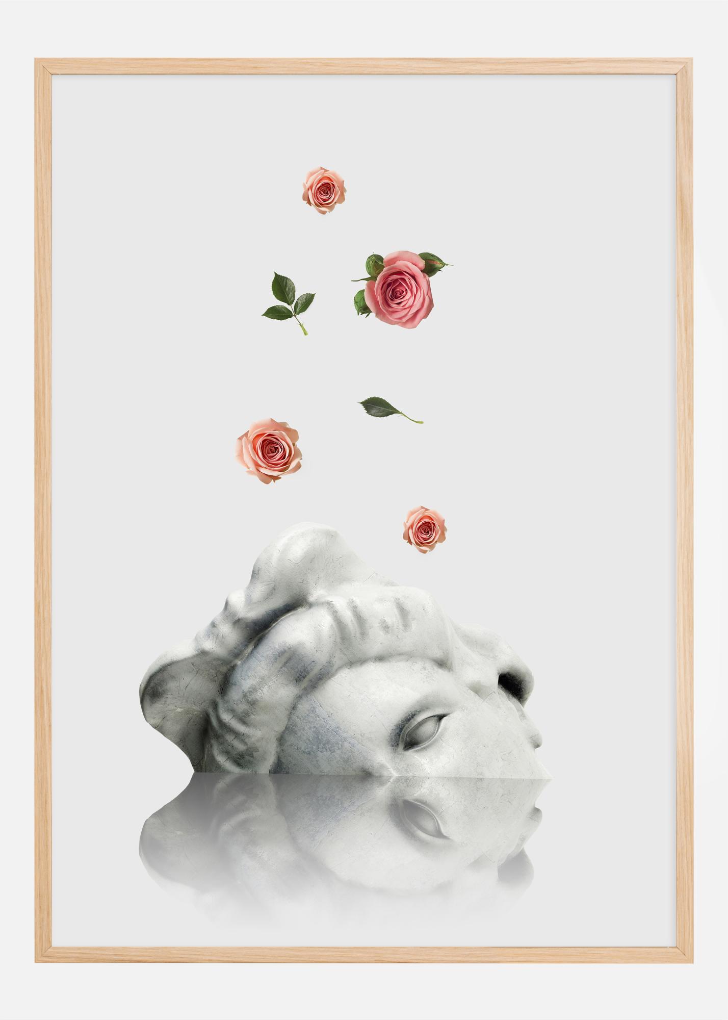 Tämä taiteellinen juliste esittelee unenomaisen sommitelman, jossa kasvojen veistos, joka vaikuttaa vajoavan tai hajoavan, on ympäröity pyörteilevillä ruusuilla eri kukinnan ja lehtien vaiheissa. Se on kiehtova kuva, joka yhdistää kiven ja kasviston kauneuden ja tarjoaa sekä ajattomuuden että katoavaisuuden tunteen.