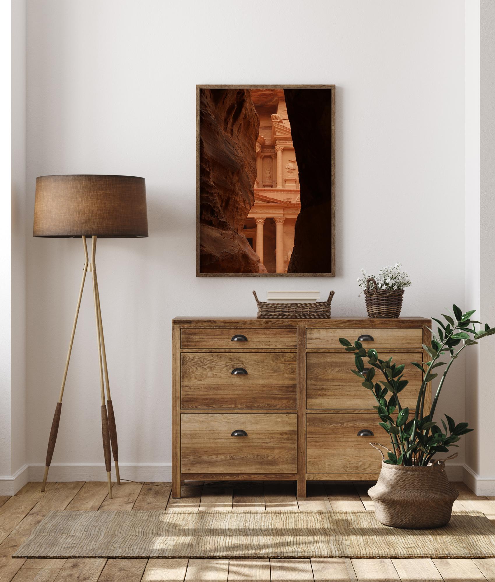 Merkkipaalujuliste Petran kulmasta Jordaniassa. Kurkista punaisten kallioiden läpi katsomaan osaa tämän upean muinaisen maailman ihmeen julkisivusta. Ripusta tämä kotiin ja lähde matkalle poistumatta kotoa, kun tutustut tähän kuuluisan maamerkin vanhaan arkkitehtuuriin kotoa käsin.