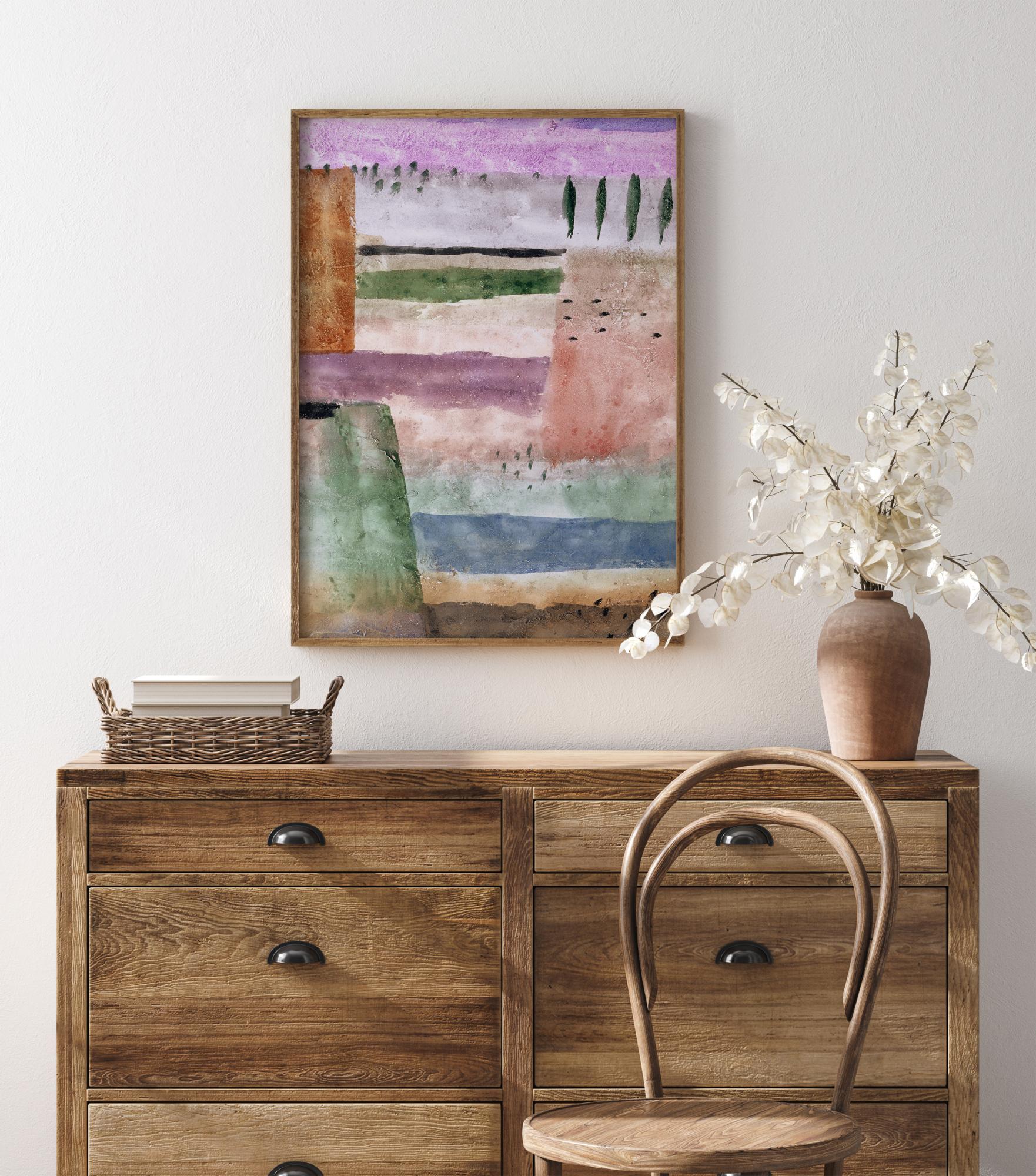 Pastellinvärinen abstrakti juliste, jossa on kerroksellinen, tekstuurinen tunnelma. Julisteessa on näennäisesti ranta, meri, vuoret, ruoho ja puut, jotka häipyvät kaukaisuuteen. Kuvassa on erilaisia sinisiä, violetteja, oransseja ja vihreitä sävyjä, kaikki pehmeässä pastellisävyssä. Tämä rauhallinen maisema saa mielesi lepäämään.