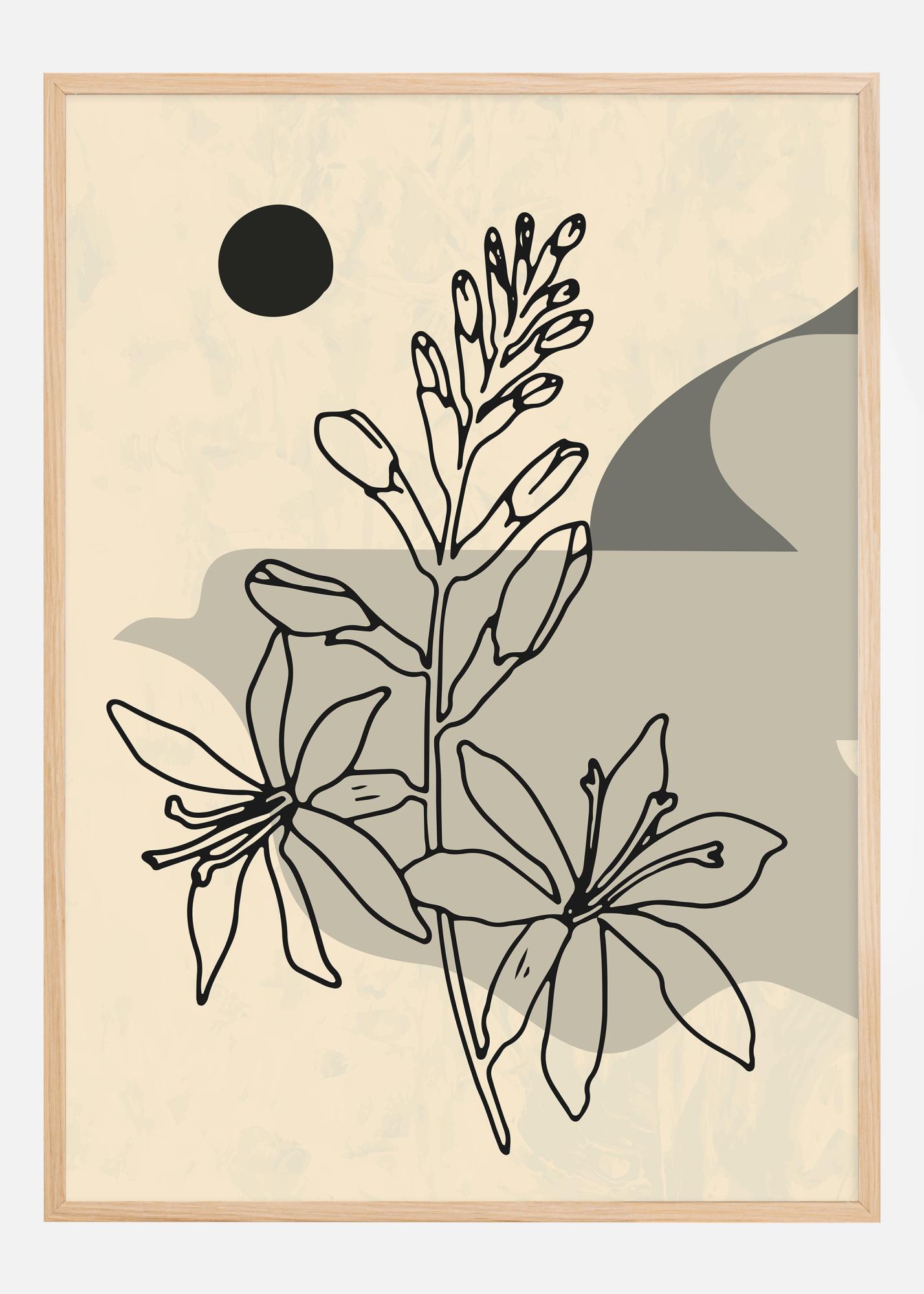 Tämä esteettisesti miellyttävä juliste vangitsee abstraktin tulkinnan kukkivista kukista, joissa graafiset linjat kohtaavat orgaaniset muodot. Teos leikkii neutraalilla beige taustalla, jota täydentää tumma, pyöreä muoto, joka antaa kontrastia ja syvyyttä. Etualalla tyylitellyt kukat ja nuput kurkottavat ylöspäin siluettina, luotuina terävillä mustilla ääriviivoilla, jotka tarjoavat vahvan visuaalisen vaikutelman.