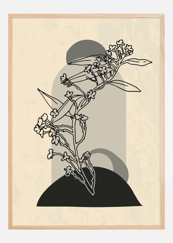 Tämä hienostunut juliste esittää abstraktin kukkaryhmän, joka yhdistää luonnonmuodot graafisiin elementteihin nykyaikaiseksi ilmeeksi. Kuvio käyttää hienovaraista väriskaalaa pehmeillä beigeillä sävyillä ja rohkeilla mustilla linjoilla, mikä luo sekä silmiinpistävän että elegantin kontrastin. Suunnittelussa korostetaan sommittelua ja tasapainoa, ja kukkien ja lehtien orgaaniset muodot sijoittuvat mustalle puolipallolle, mikä luo varjo- ja syväilluusion.