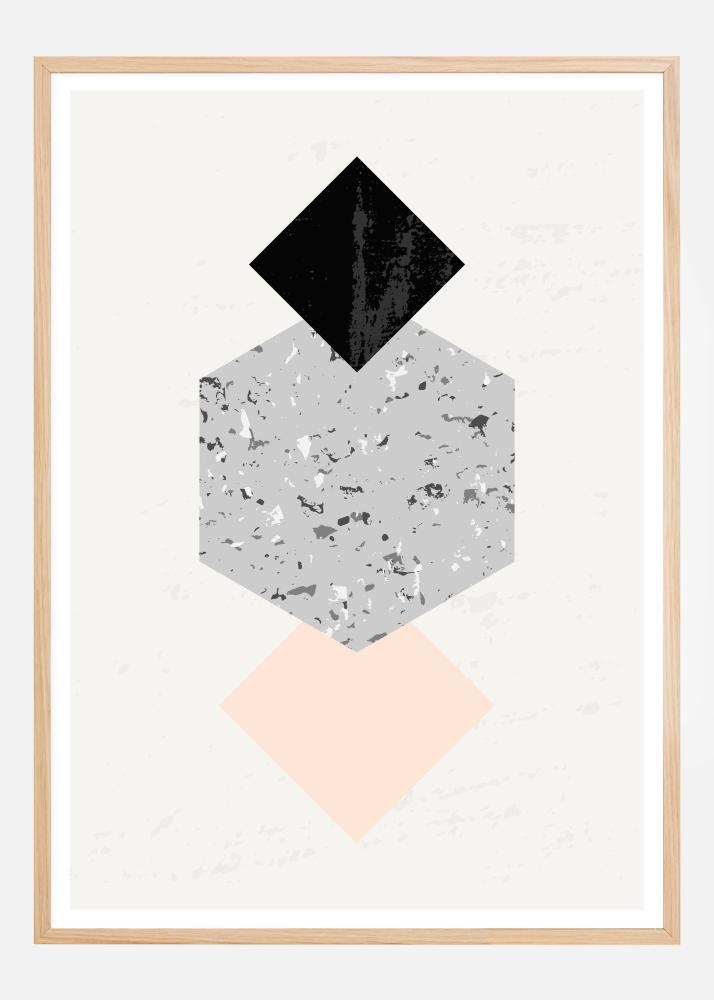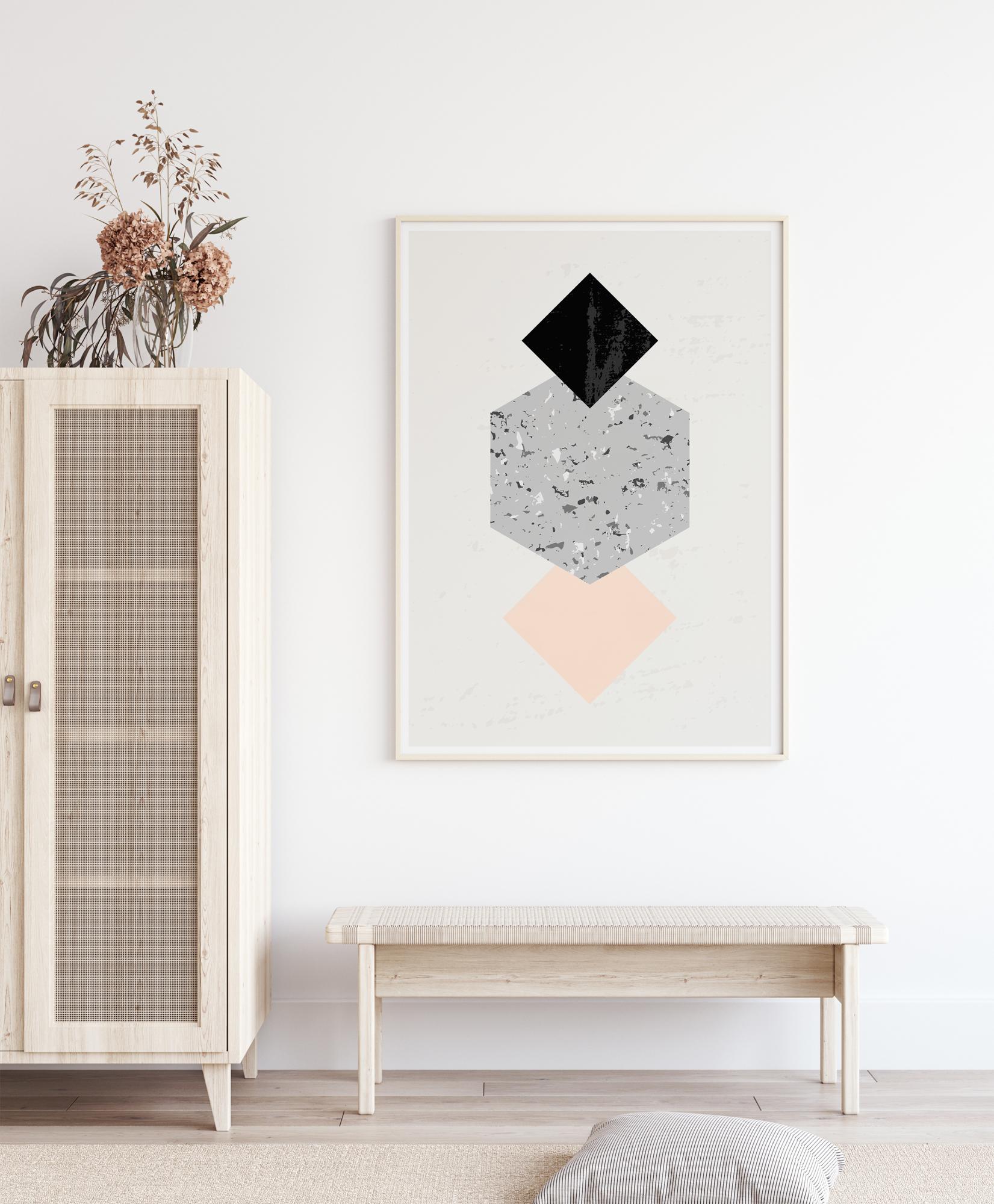Geometrinen abstrakti juliste, jossa on kaksi erilaista neliötä. Vaikka neliöt ovatkin 2D, niiden kulmat huijaavat silmää näkemään kuutioita. Nämä kuutiot ovat täytetty hauskoilla pienillä pilkuilla, jotka muodostavat sinisiä, harmaita ja mustia väriläiskiä. Luo dramaattinen seinä, kun yhdistät tämän yksinkertaisen teoksen rohkean väriseen seinään.