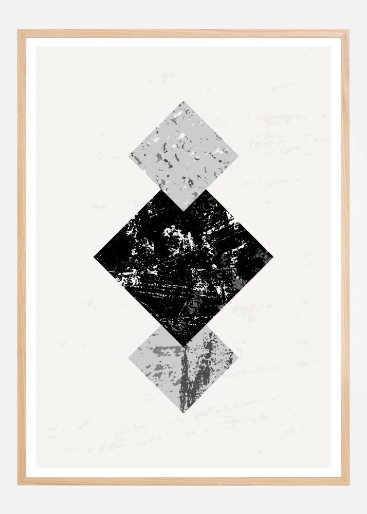 Geometrinen juliste, jossa kolme neliötä on valkoisen taustan keskellä. Keskellä oleva suuri neliö on musta, jossa on marmoriefektejä. Kummallakin sivulla on kaksi pienempää sinistä neliötä, joissa on marmori- ja pikkukiviefektit. Silmä huomaa kunkin neliön kohdat koko teoksen läpi tässä lähes symmetrisessä teoksessa.
