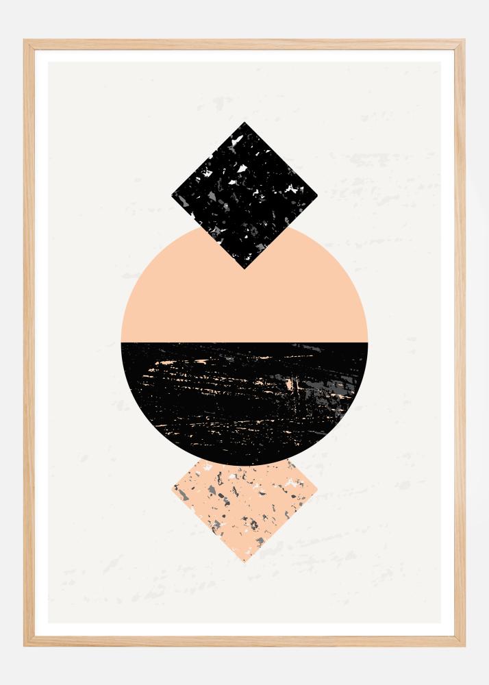Kontrastinen ja geometrinen juliste, jossa abstrakteja neliöitä ja ympyröitä. Keskellä oleva suurin ympyrä on jaettu persikanväriseen yläpuoliskoon ja mustaan alapuoliskoon, joka näyttää yölliseltä kaupungilta. Kontrastin vuoksi vaaleanpunainen neliö lepää mustaa vasten ja musta neliö on ympyrän persikanvärisen osan päällä.
