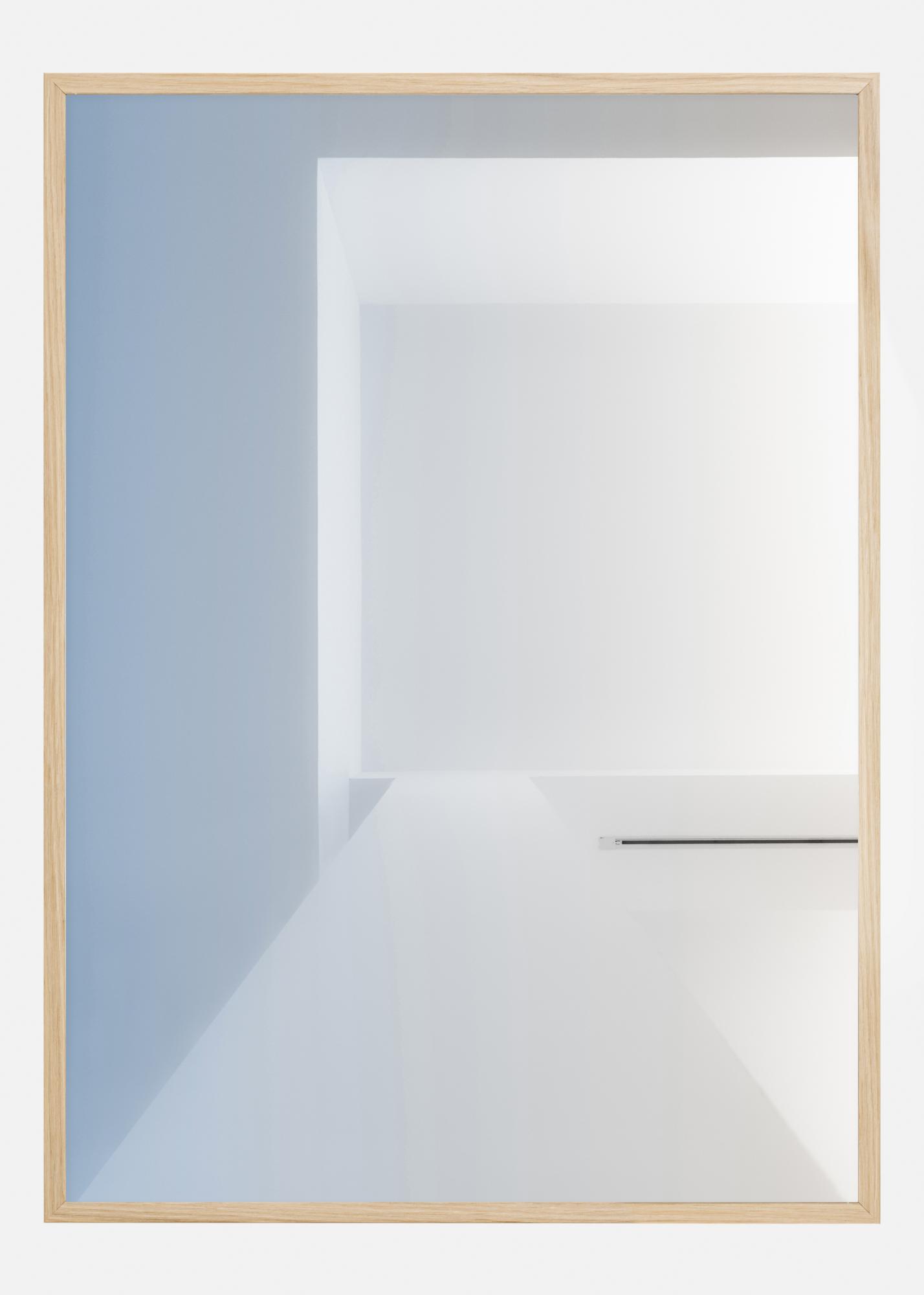 Rauhoittavia sinisiä ja valkoisia sävyjä sisältävä abstrakti sisustusjuliste. Päätausta on pehmeän sininen, ja siinä on valkoinen neliö, joka näyttää ikkunalta ja työtasolta. Oikealla oleva pehmeä valkoisen sävyinen pläjäys tuntuu kuin aurinko olisi puhjennut läpi, mikä tuo rauhallisuutta kotiisi.