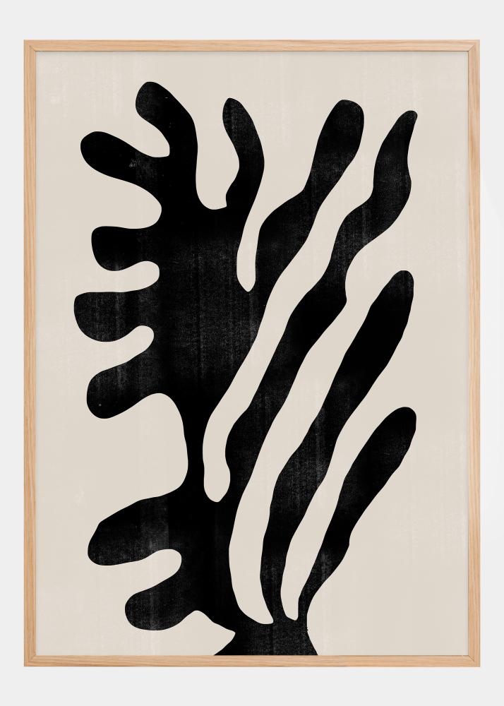 Voimakkaalla ja abstraktilla ilmaisullaan tämä juliste kutsuu tulkitsemaan luonnon elinvoimaa. Rohkeat mustat muodot, jotka muistuttavat kasvin lehtiä tai eksoottista kukkaa, ovat vastakohtana kermaanvalkoista taustaa vasten luoden dynaamisen ja dramaattisen vaikutelman. Tämä taideteos vangitsee luonnon orgaanisen kauneuden minimalistisella mutta rohkealla kielellä.