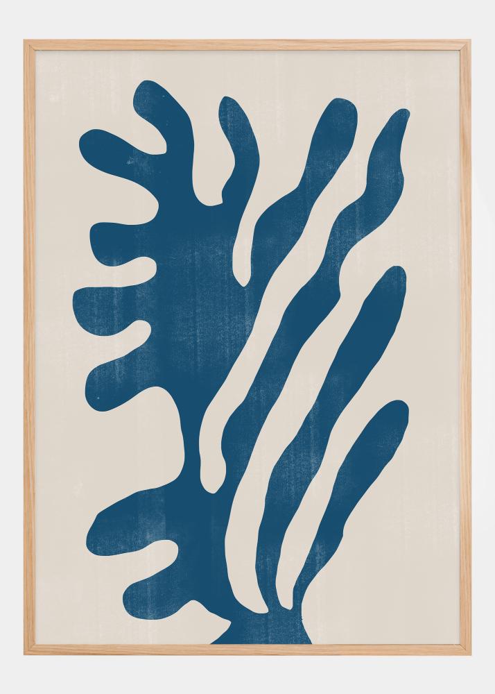 Tämä rohkea ja elävä juliste vangitsee abstraktin lehvistön olemuksen pyyhkäisevine sinisine linjoineen kermaisella taustalla. Tyylitelty aihe muistuttaa vedenalaista kasvillisuutta tai höyheniä, jotka tanssivat tuulessa, tuoden tunteen vapaudesta ja luonnosta. Tämä taideteos yhdistää orgaanisen kauneuden moderniin graafiseen muotoiluestetiikkaan.