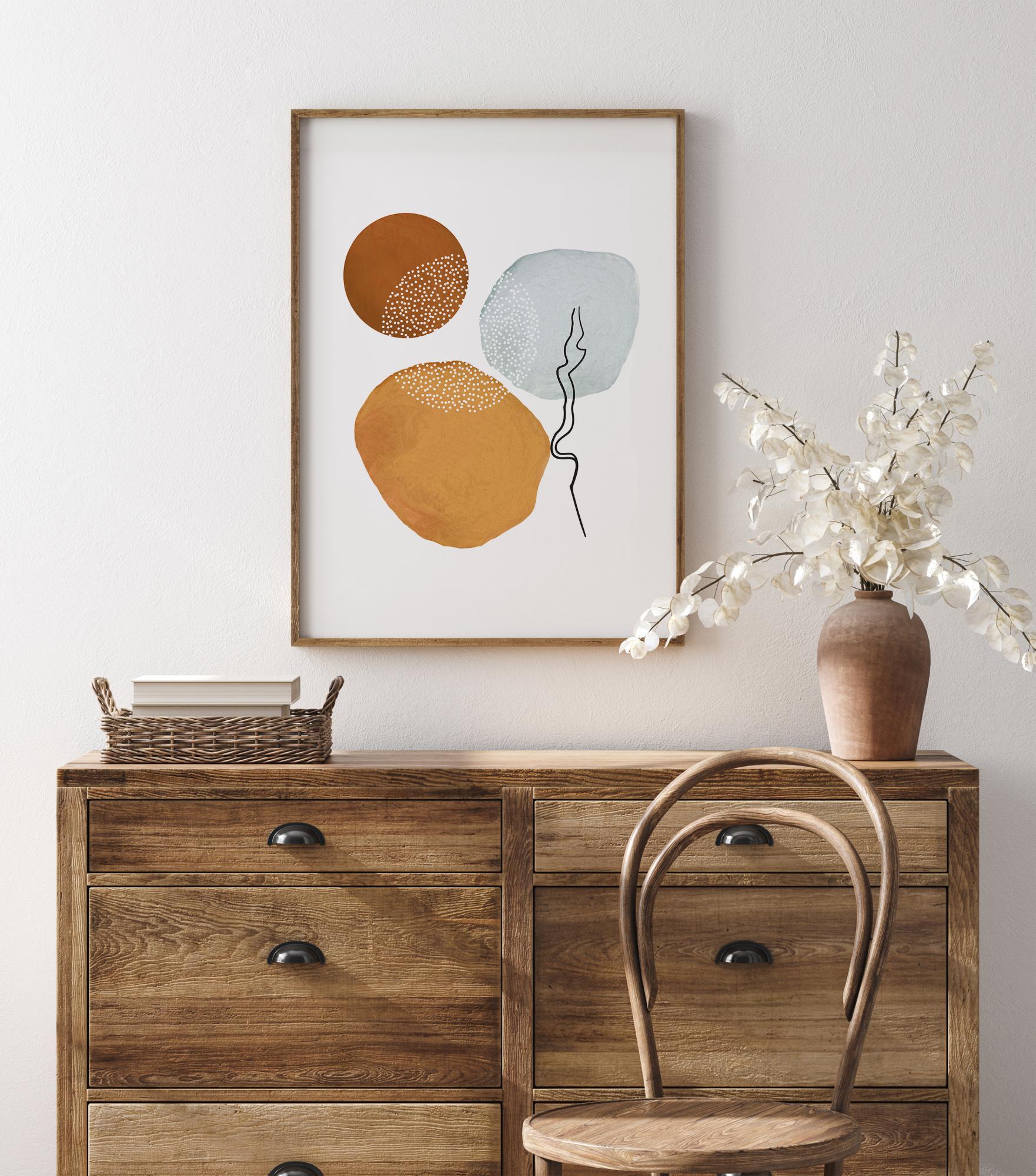 Yksinkertainen abstrakti juliste, jossa on kolme keskeistä ympyränmuotoista muotoa. Näiden kolmen muodon päällä on ympyrä, joka on tehty pienistä valkoisista pisteistä kuin voikukkakello. Kaksi yksinkertaista viivaa kiemurtelevat sinisen muodon poikki ja yhdistävät teoksen yhdeksi kokonaisuudeksi. Tämä tuloste sopii mainiosti hienostuneen gallerian seinälle.