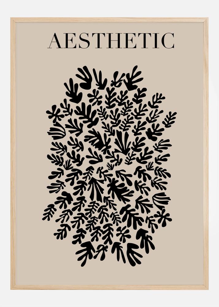 Sen modernin ilmaisun ja yksinkertaisen väripaletin ansiosta, joka rajoittuu mustaan ja beigeen, tämä printti antaa rauhoittavan ja tasapainoisen vaikutelman. Sanan "AESTHETIC" sijoittaminen kuvan yläosaan toimii voimakkaana muistutuksena muotoilun ja luonnon ikuisesta kauneudesta. Tämä juliste olisi erinomainen sisustuksessa, jossa halutaan luoda rauhan ja inspiraation keidas tai osana suurempaa tauluseinää luomaan yhteen kokoavia visuaalisia elämyksiä.