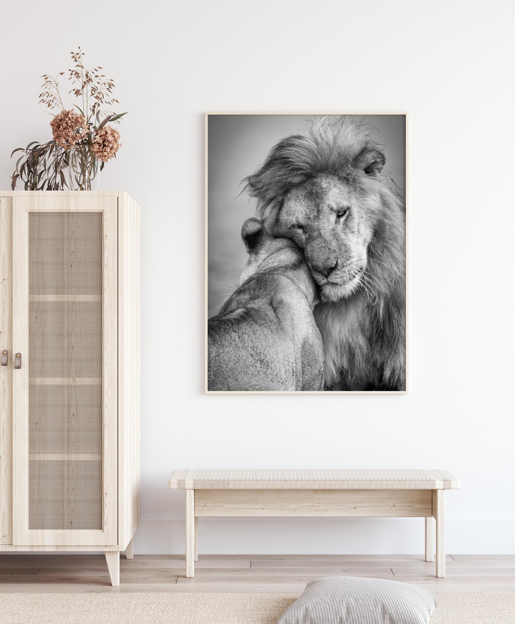 Luontojuliste, jossa leijona ja leijonanaaras hellässä hetkessä. Tässä upeassa mustavalkoisessa otoksessa urosleijona nuoleskelee naarasleijonaa, kun tämä painautuu leijonan kaulaan selkä katsojaan päin. Tunne rakkautta tässä lämpimässä syleilyssä, kun heräät joka aamu.