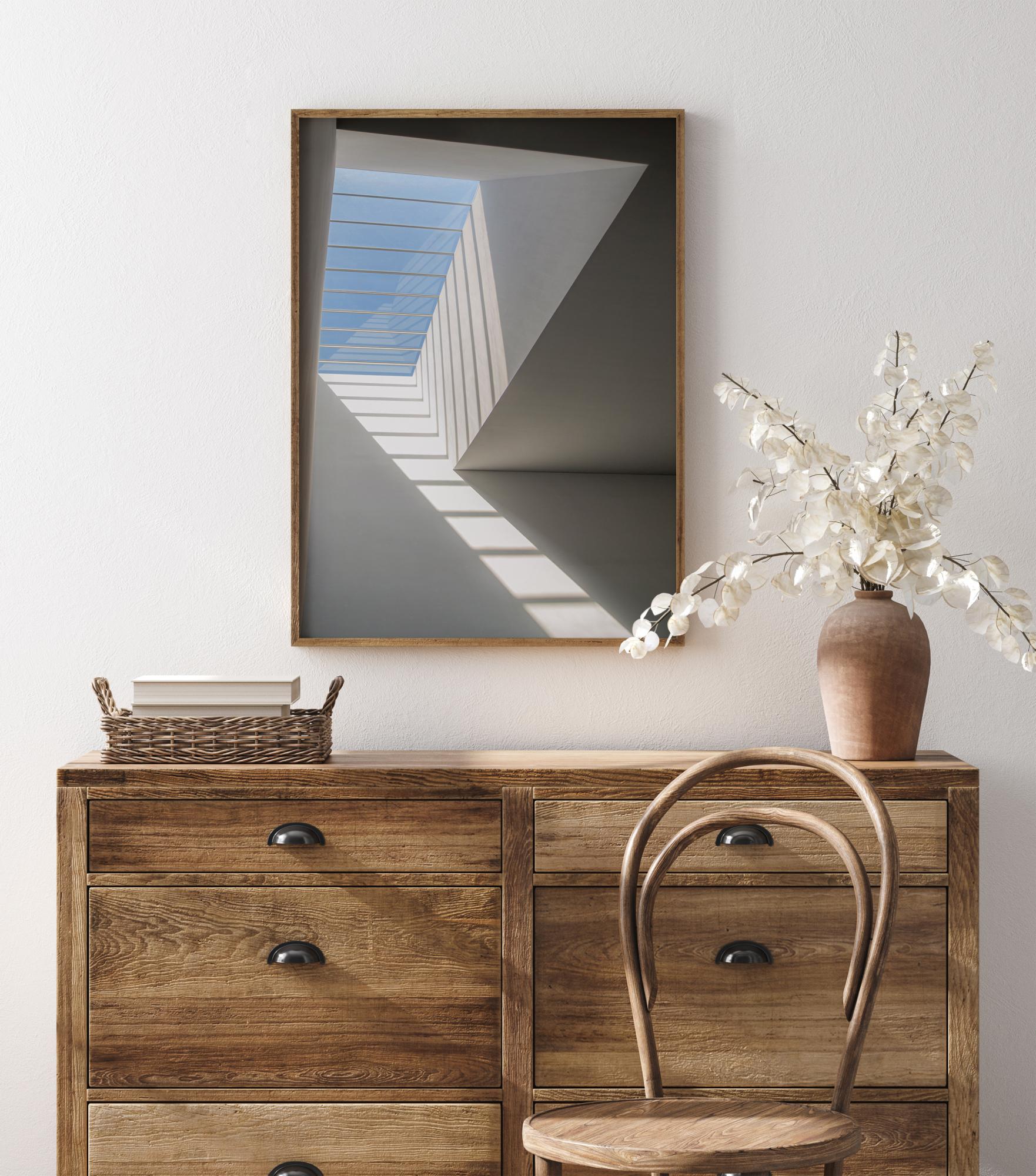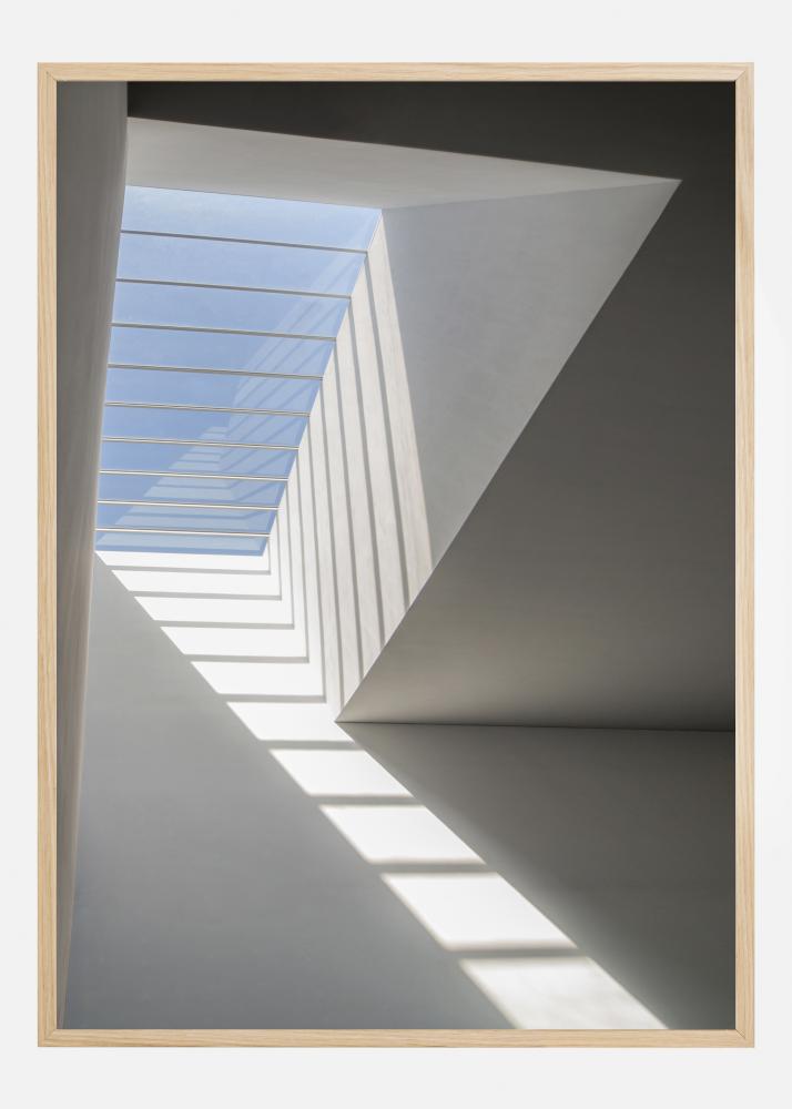 Yksinkertainen ilmava juliste kirkkaan valkoisen huoneen sisustukseen. Vasemmalla on kattoikkuna, josta näkyy sininen taivas. Sisään virtaava valo heittää varjoja, jotka näyttävät tikkailta, ja jotka johdattavat katseen ylös tuohon valoon ulkona. Lisää valoisuutta pimeään huoneeseen tällä rauhallisella kuvalla.