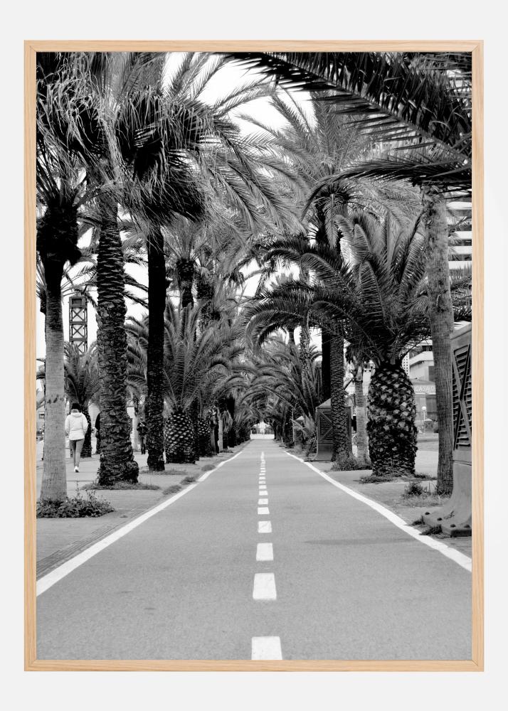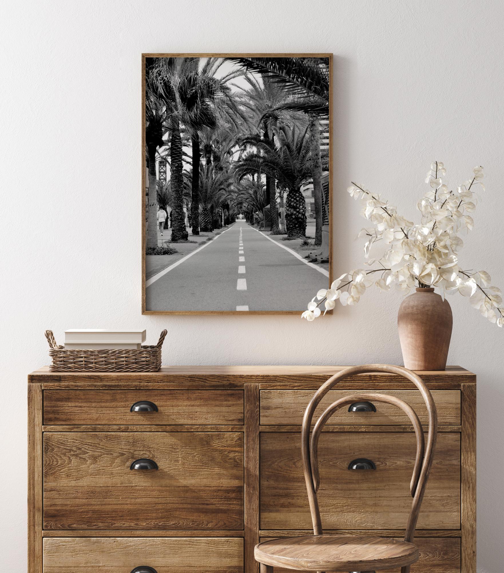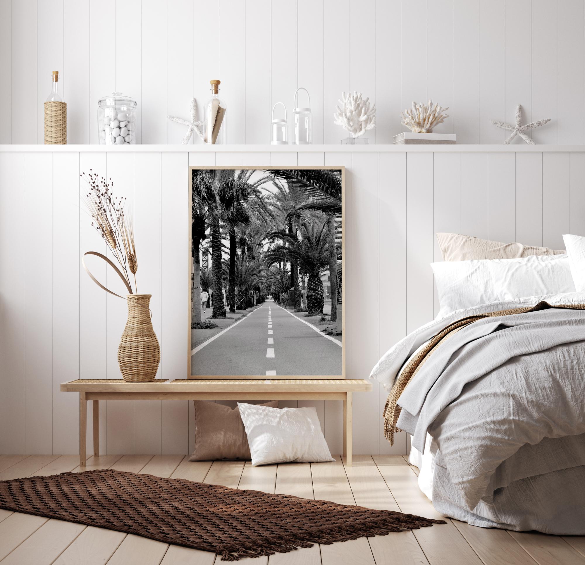 Maisemajuliste palmupuiden metsikön läpi kulkevasta tieosuudesta. Palmut muodostavat tien reunan, kun valkoiset viivat johdattavat sinut kauas kaukaisuuteen. Puut muodostavat kaaren, joka suuntaa katseesi. Lisää tämä mustavalkoinen kaunotar seinällesi eksoottisen tunnelman luomiseksi.