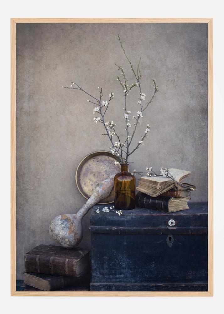 Asetelmajuliste, jossa on sininen arkku, ja jossa on maljakko, lautanen, vanhoja kirjoja ja nuppuisia kukkia. Asetelma on sommiteltu yksinkertaiselle harmaalle taustalle, joka saa sinisen arkun korostumaan. Jos haluat maalaismaisen tunnelman, lisää tämä neutraalille seinälle ja nauti alkukevään kukista paljailla oksilla.