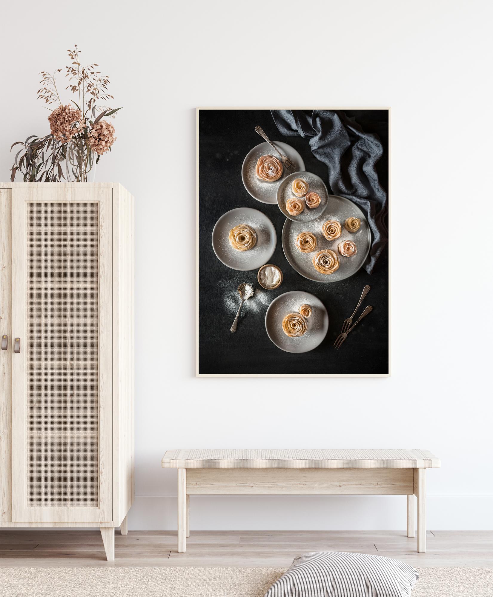 Yksinkertainen päivällisjuliste, jossa on tarjottimilla erilaisia makeita leivonnaisia. Nämä omenatortut ovat uskomattoman hienotekoisia, kunkin päälle on ripoteltu tomusokeria ja ne ovat muotoiltu hauraaksi ruusuksi. Valkoiset lautaset ja kullanruskeat leivonnaiset erottuvat mustaa pöytäliinaa vasten. Olet jo valmiiksi makeannälkäinen tämän kanssa kotona.
