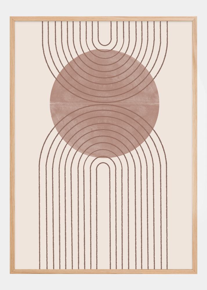 Tämä juliste kutsuu sisäänsä rauhan ja orgaanisen virran tunteen pehmeillä, pyyhkäisevillä viivoilla, jotka kokoontuvat keskusympyrän ympärille lämpimässä, terrakotan sävyssä. Rauhoittava kuvio muistuttaa tuulen muovaamia hiekkadyyniä tai rauhallisia aaltoja, jotka vyöryvät rannalle, tarjoten hetken pohdintaa ja rauhaa.