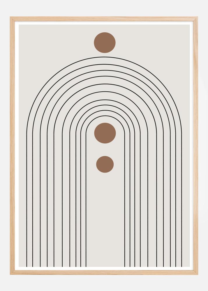 Tämä graafinen juliste kuvaa tyyliteltyä kaarimaista aihetta, joka herättää yksinkertaistetussa muodossa monumentaalisen arkkitehtuurin tunteen. Mustat viivat muodostavat puolipyöreän kuvion, joka luo syvyyden ja ulottuvuuden illuusion, kun taas sijoitetut ruskeat ympyrät tuovat luonnonmukaista kontrastia muuten tiukkaan geometriaan. Tämä abstrakti teos on sekä kurinalainen että leikkisä, harmonisella tasapainolla kaarien ja lineaaristen elementtien välillä.