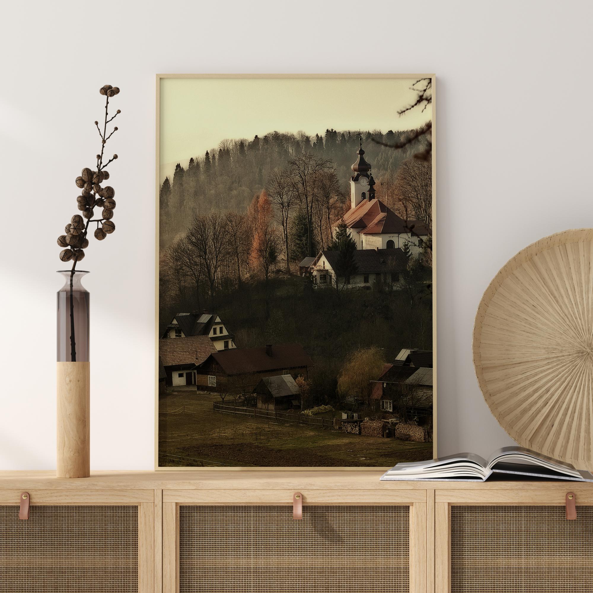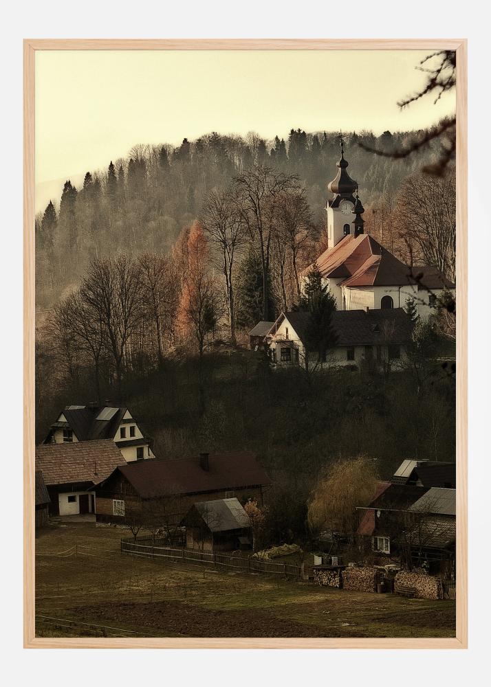Kaupunkikuvajuliste pienestä maaseutukylästä, jossa on vanhoja taloja ja peltoja, ja joiden takana on puiden peittämiä kukkuloita. Valkoinen kirkontorni kohoaa maiseman hillittyjä ruskeita ja vihreitä sävyjä vasten. Upota itsesi ja mielikuvituksesi tähän viehättävään kylään, kun lisäät tämän julisteen seinällesi.