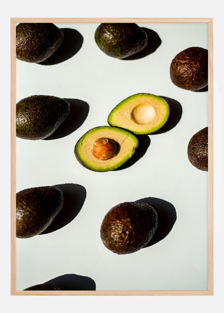 Tämä juliste kunnioittaa avokadon yksinkertaista kauneutta, hedelmää, josta on tullut terveellisen ruoan ja modernien keittiötrendien ikoni. Koko avokadon tummanvihreät, kyhmyiset kuoret kontrastoituvat avonaisen puolikkaan kanssa, joka paljastaa sileän, vaaleanvihreän sisuksen ja kiiltävän, ruskehtavan ytimen. Tämä tekstuurin ja värin leikki luo leikkisän ja samalla tyylikkään estetiikan.