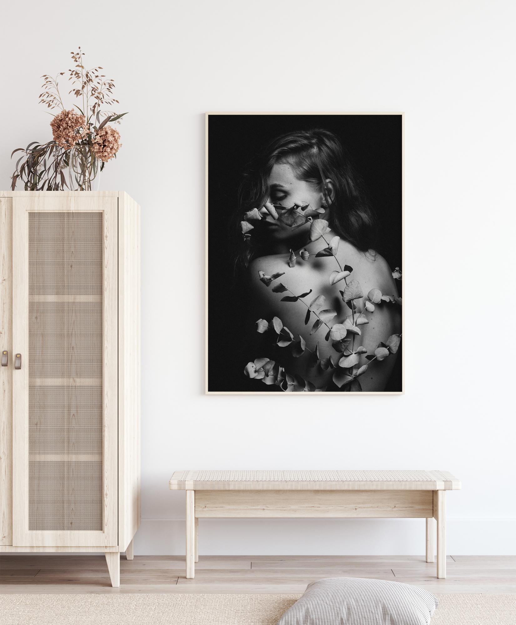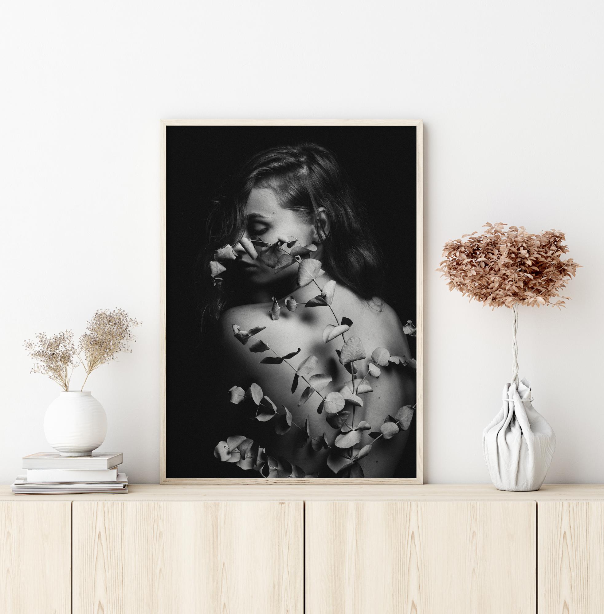 Kaunis juliste naisesta, jonka selässä on lehtiä. Yhdistä tämä mustavalkoinen otos eloisan seinävärin kanssa saadaksesi dramaattisen vaikutelman. Tunne salaperäisyys ja rauha ja tuo se kotiin.