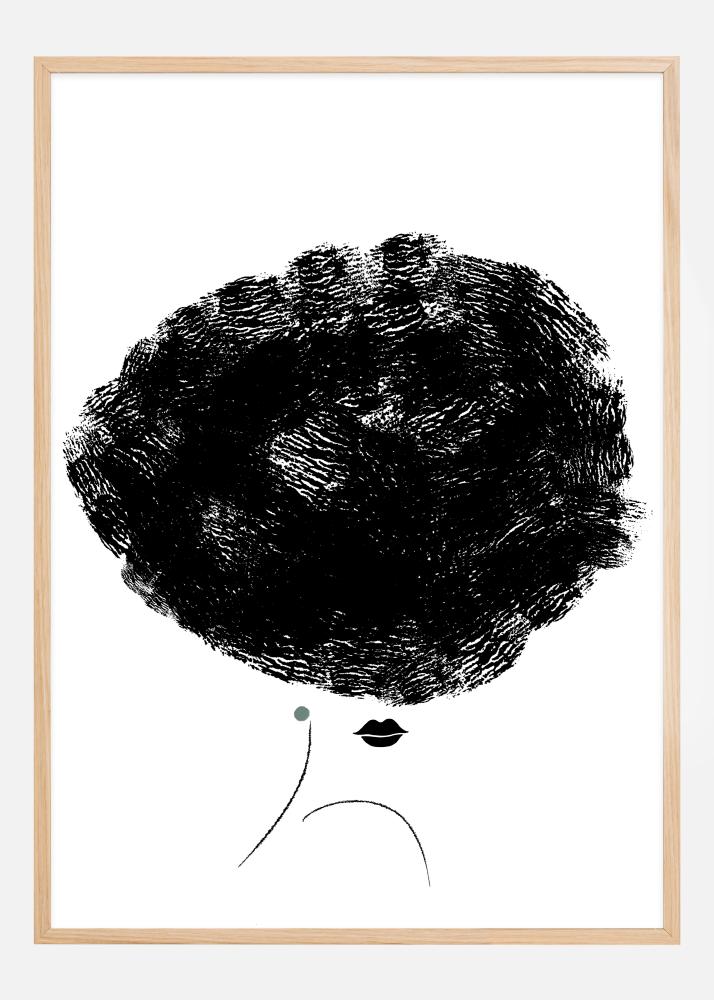 Tämä konseptuaalinen juliste esittää minimalistisen mutta ilmeikkään naisprofiilin, jossa hänen suuret, runsaat hiuksensa hallitsevat näyttämöä. Hiukset, jotka on kuvattu voimakkailla ja paksuilla siveltimenvedoilla mustalla, luovat dramaattisen kontrastin valkoista taustaa vasten ja antavat tunteen dynaamisesta liikkeestä, joka on vangittu hiljaiseen hetkeen. Pieni, hienovarainen vihreä piste, joka on sijoitettu korvan viereen, rikkoo monokromaattisuutta ja lisää hienovaraista väriaksenttia. Tämä printti korostaa olennaista muodoissa ja väreissä, ja tarjoaa rohkean, modernin estetiikan mihin tahansa nykyaikaiseen tilaan.